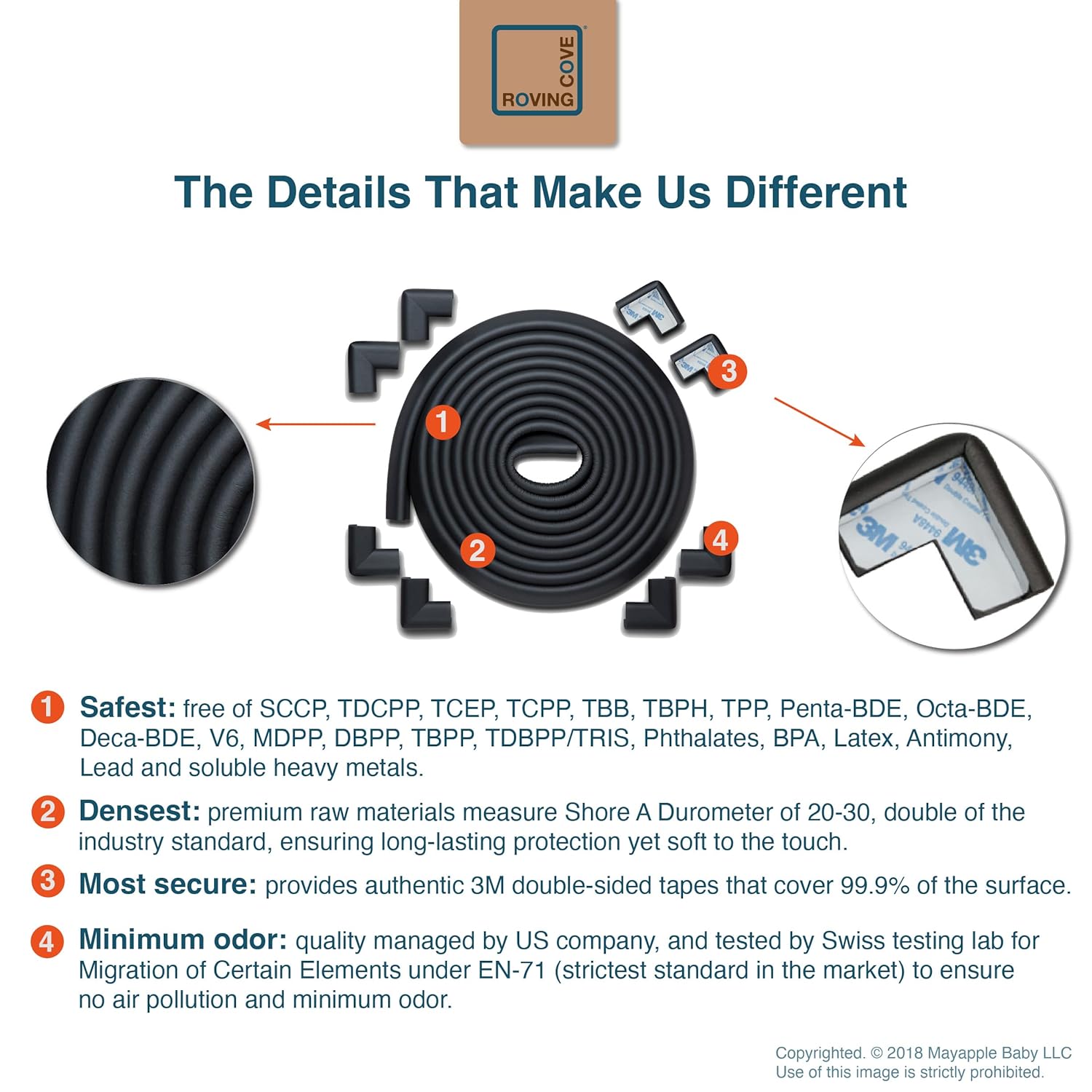 - CLEAN SAFETY: Roving Cove uses safe and pure raw material and was the first brand to make foam safety bumpers without the use of toxic flame-retardant chemicals (SCCPs). Our edge corner guards contain no BPA, no phthalates, no heavy metals, no latex, no SCCPs. Inherently flame-resistant; passed flammability tests under US regulations.
