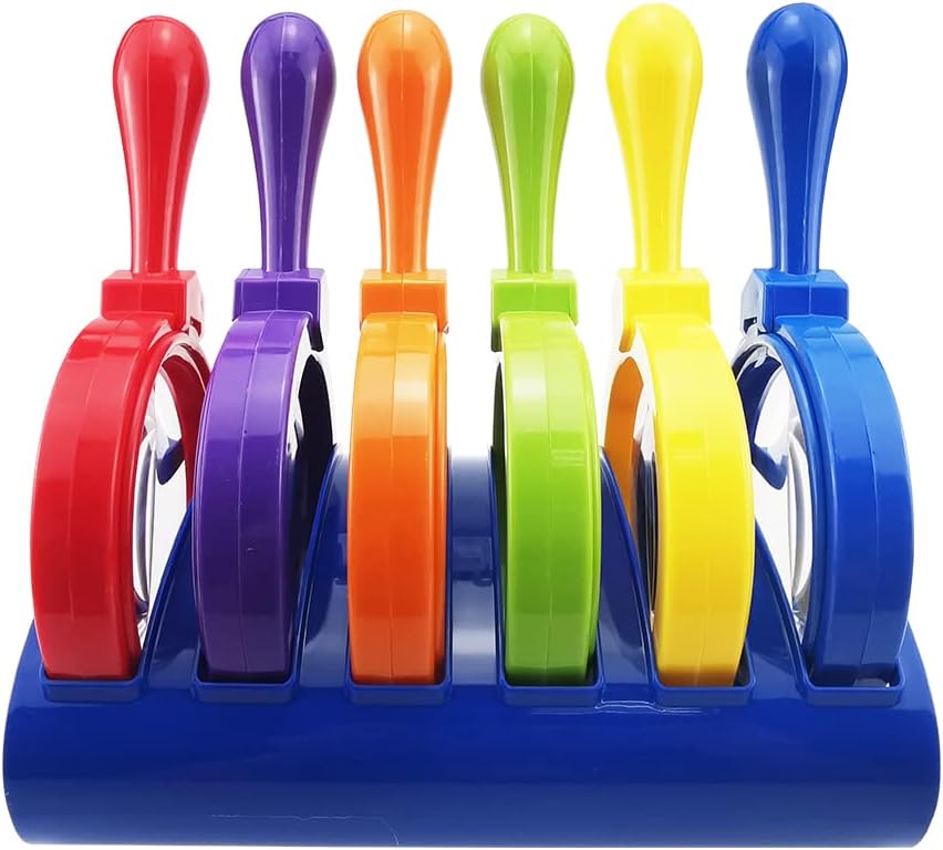 - COLOR THE FUN -Each magnifying glass comes in a different bright color include red,orange,yellow, green, blue, purple.A variety of colors,looks like the rainbow general good.The design of the stand makes the product more convenient and tidy .
