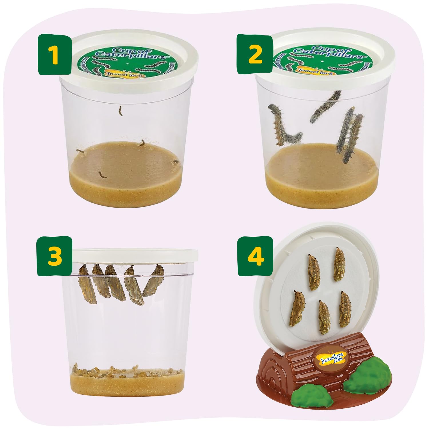 - Includes 1 cup with 5 caterpillars, all the nutritious food they need, Chrys-A-Lid Holding Log, Stickers and detailed care instructions. Just add the Insect Lore habitat sold seperately and watch them grow!