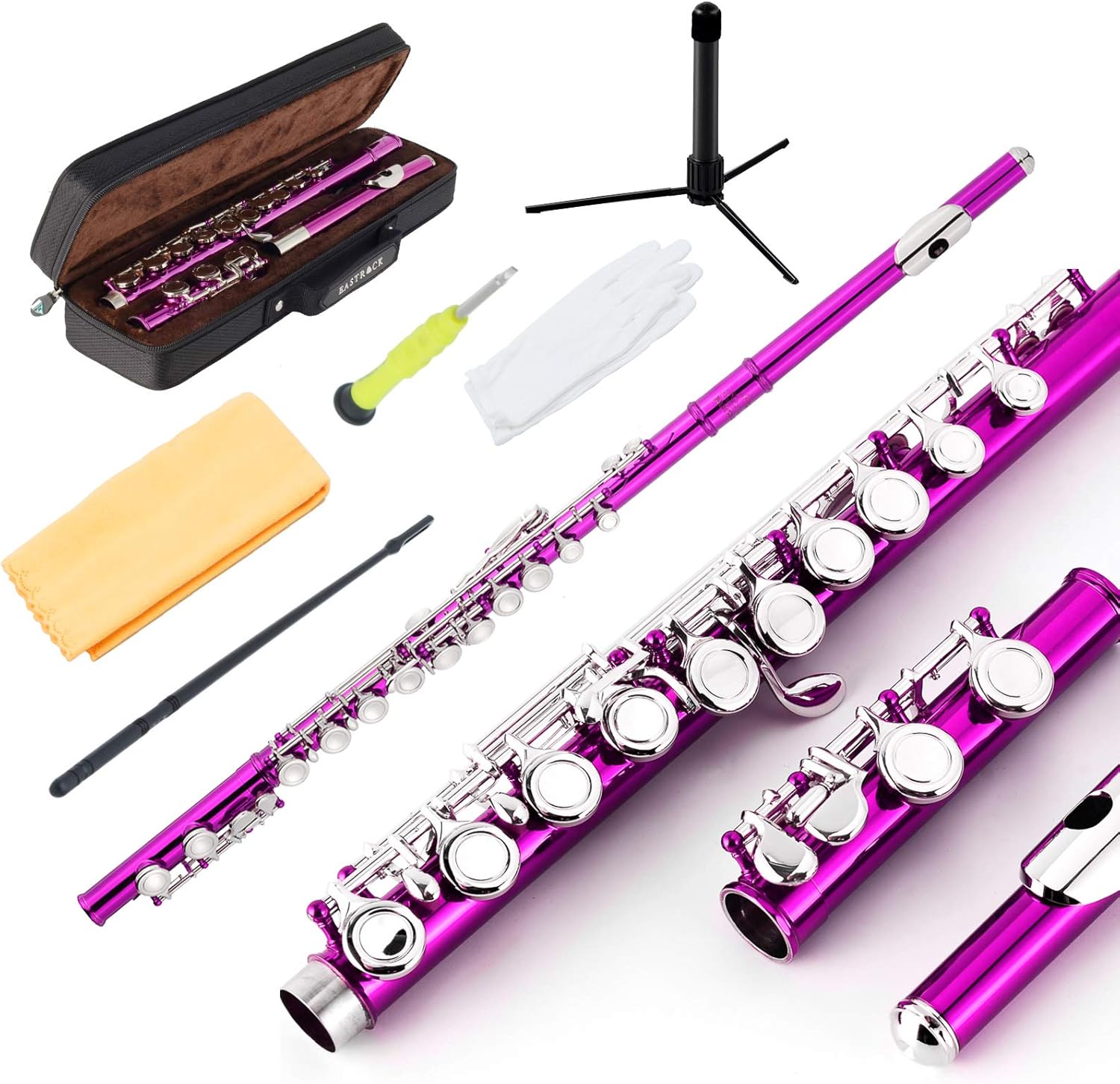 EASTROCK Closed Hole Flutes C 16 Key for Beginner, Kids, Student -Nickel Flute with Case Stand and Cleaning kit (Pink)