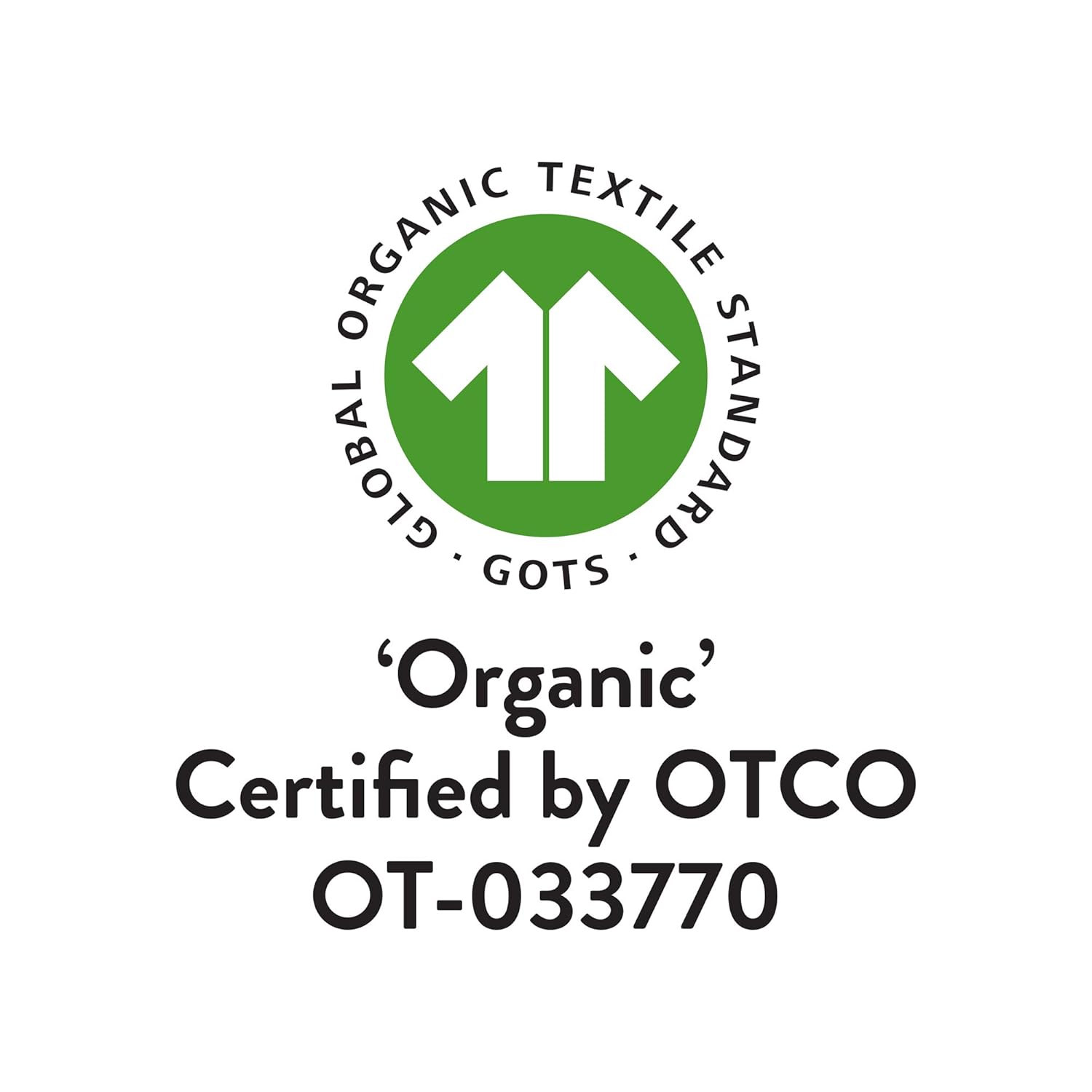 - 100% ORGANIC COTTON certified by GOTS: GOTS is the leading world-wide standard for products made in sustainable manufacturing facilities without the use of synthetic pesticides, are non-toxic, PVC free and made without heavy metal phthalate dyes