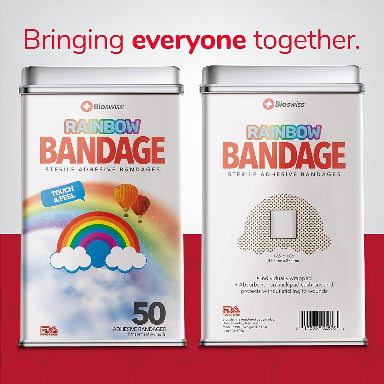 - RAINBOW BANDAGES: This 50 piece tin of funny rainbow bandages is great for putting a smile on kids' faces while protecting wounds such as cuts, scrapes, and burns; sticky bandages are perfect for kids and adults alike, and also for school nurses and pediatric doctors