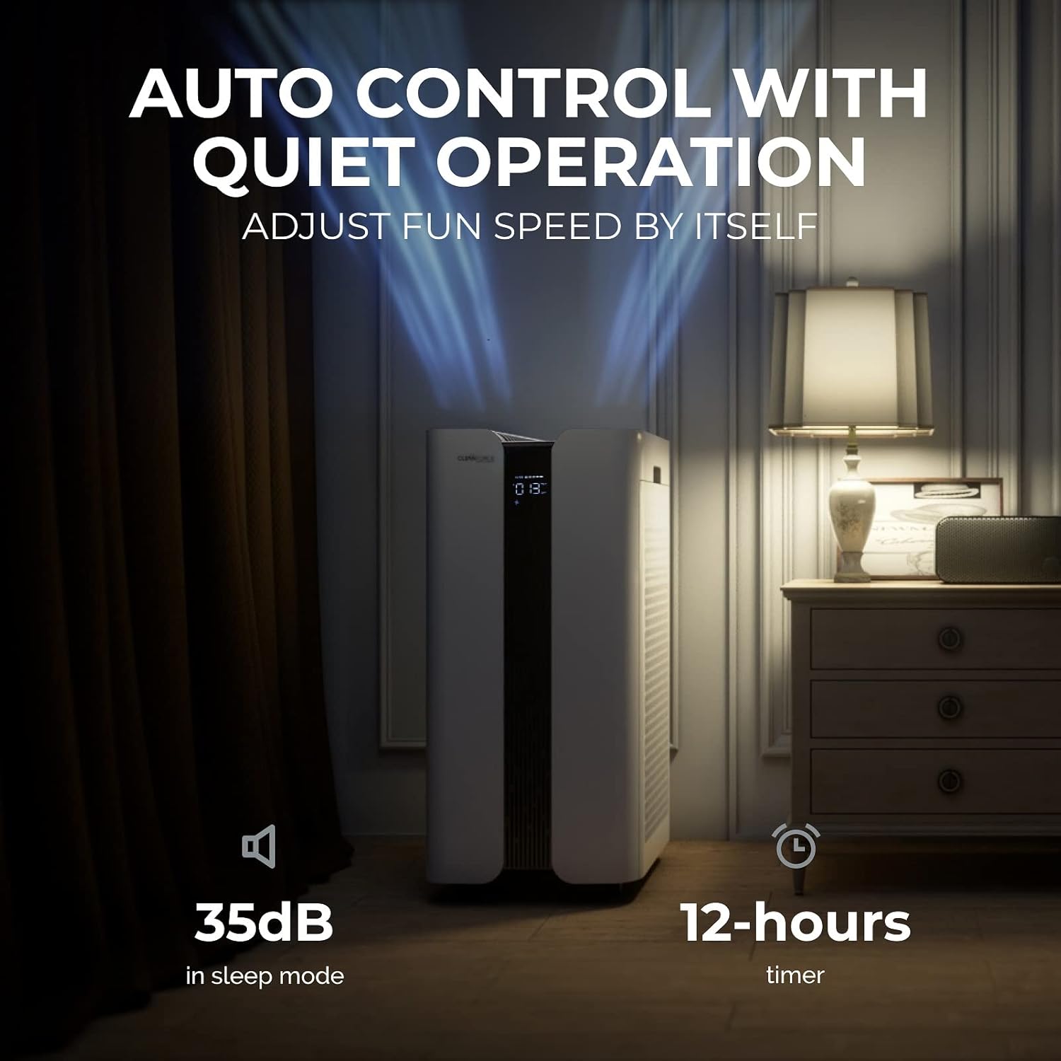 - ā SMART AUTO MODE&QUIET OPERATION: The smart air purifier will adjust its fan speed automatically based on your real-time air quality at the smart mode. Quiet enough to sleep even with such a large CADR - at just 35dB on the lowest setting. Quiet air purifier for bedroom,living room,office, classroom.