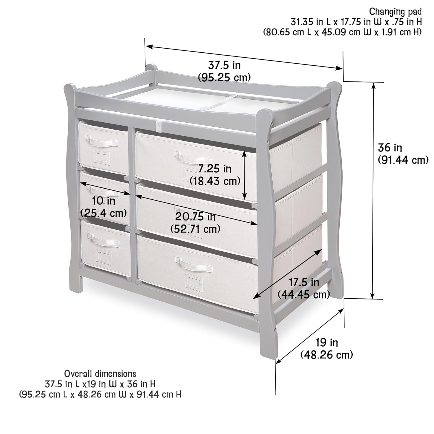 Badger Basket Sleigh Style Baby Changing Table - Diaper Station with 6 Removable Storage Baskets, Safety Rails, Pad, and Belt - Nursery Organizer - Cool Gray