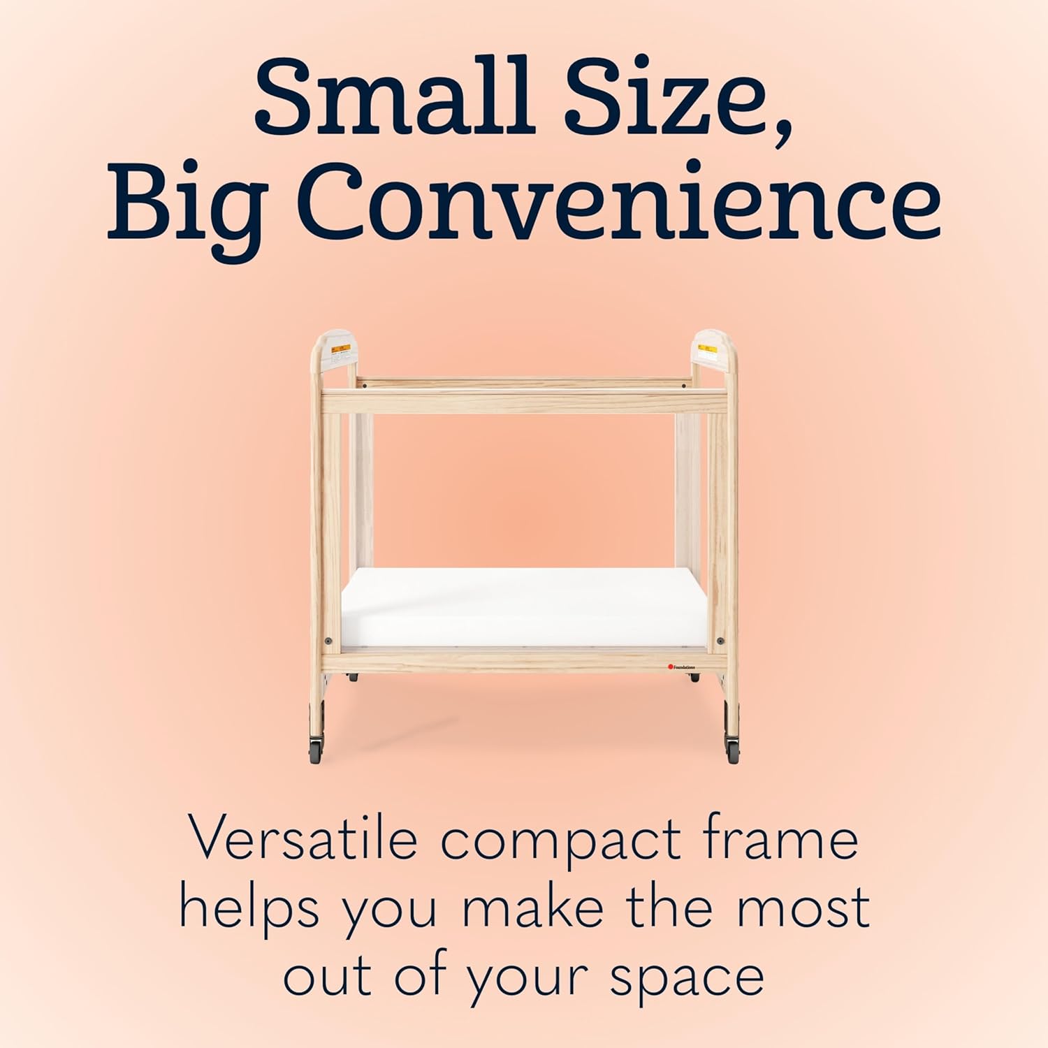 - Compact Wood Crib: Durable, fixed-side compact crib design is perfect for childcare centers. Assembled dimensions: 39.75” L x 26.25” W x 42.1” H, with a weight of 50 pounds.