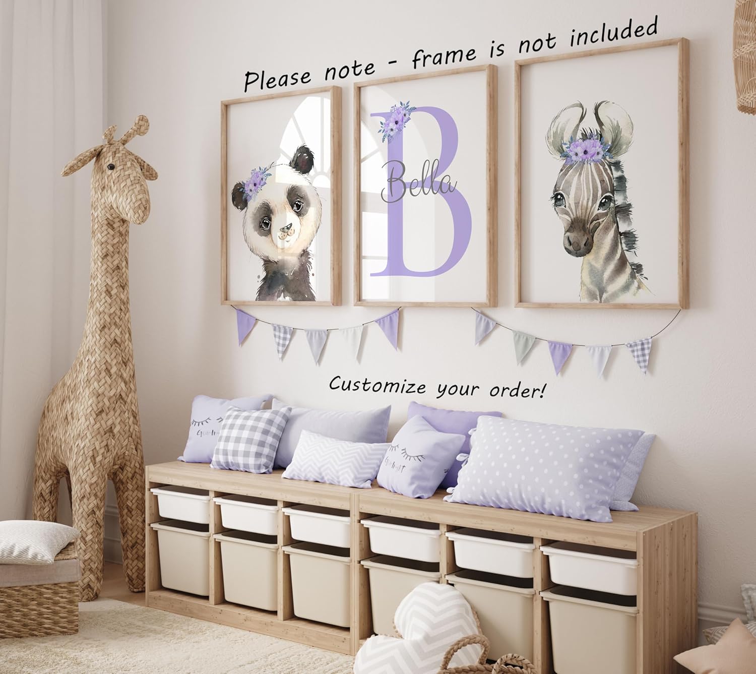 Personalized Safari Animals for Baby Girls Nursery, Set of 3 Unframed Poster Prints, Personalized Name Pink Lilac Floral, Girls Bedroom Decor, Elephant Giraffe (9x12)