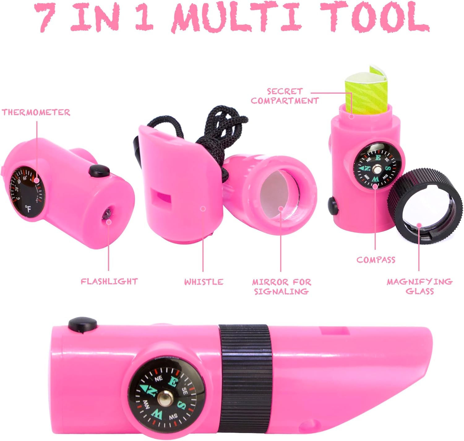 - š 7 IN 1 MULTI TOOL contains FLASHLIGHT, MIRROR for signalling, MAGNIFYING GLASS, WHISTLE for quick location, THERMOSTAT, COMPASS, and SECRET COMPARTMENT.