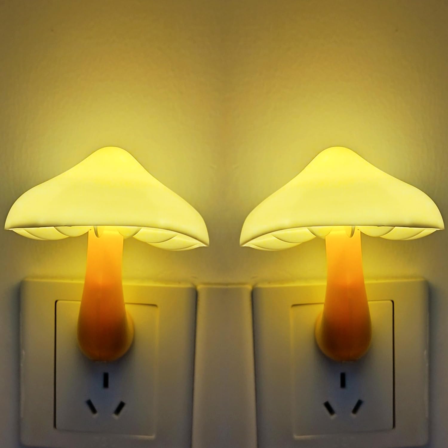 - Package includes 2 pcs of warm white mushroom-shaped night lights with dusk to dawn sensor