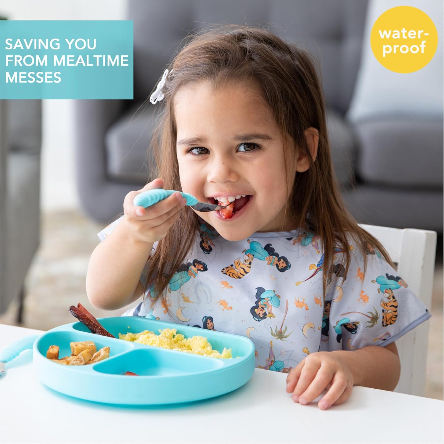 - SOFT YET STRONG – Bumkins signature waterproof fabric is durable and stands up to messes, yet it’s lightweight and comfortable for your little one; wash and reuse over and over again