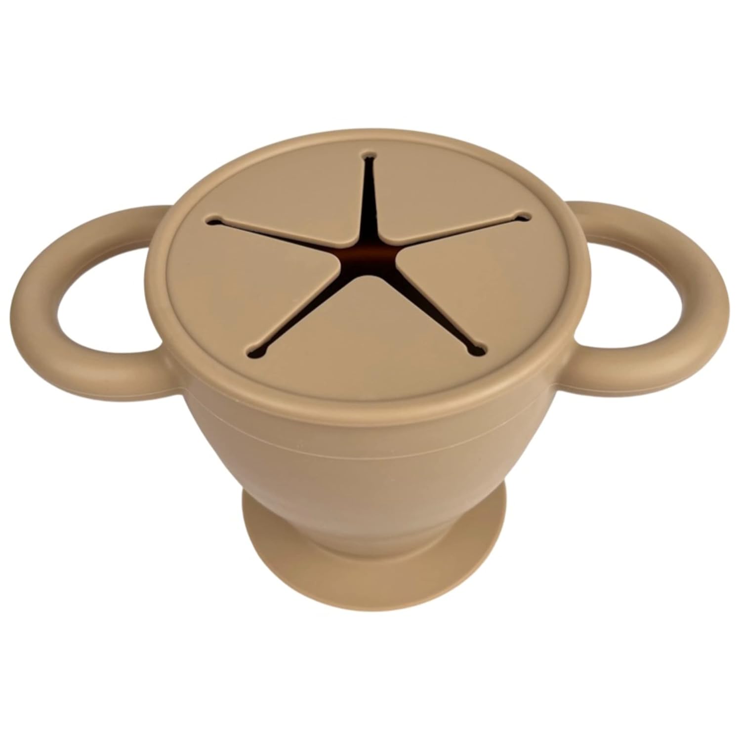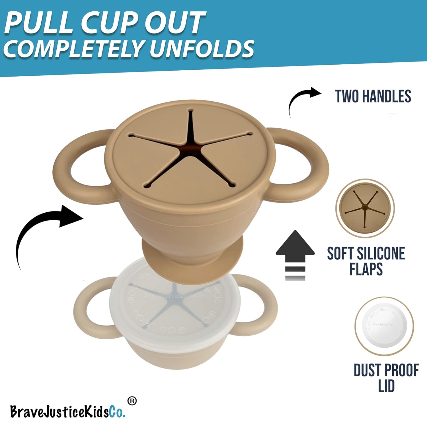 BraveJusticeKidsCo. | Snack Attack II Snack Cup | Collapsible Silicone Snack Container | Toddler and Baby Snack Catcher Lid (Warm Sand)