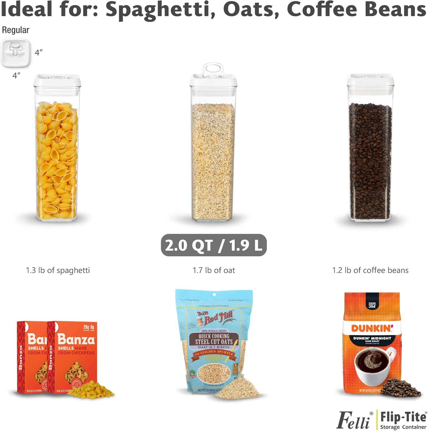 - AVAILABLE IN VARIOUS SIZES & SHAPES: The Felli Flip-Tite container comes in a variety of sizes and shapes to meet different food storage needs. The 4" REGULAR and RECTANGULAR sizes are perfect for organizing small kitchen counters and pantries, making handling and pouring easy. The 5" LARGE size is ideal for storing items like sugar and beans that need scooping. The 6" XL size is specifically designed for storing large quantities of food such as rice, powder, and flour, which require measuring spoons. We offer a versatile storage solution to suit all your needs.