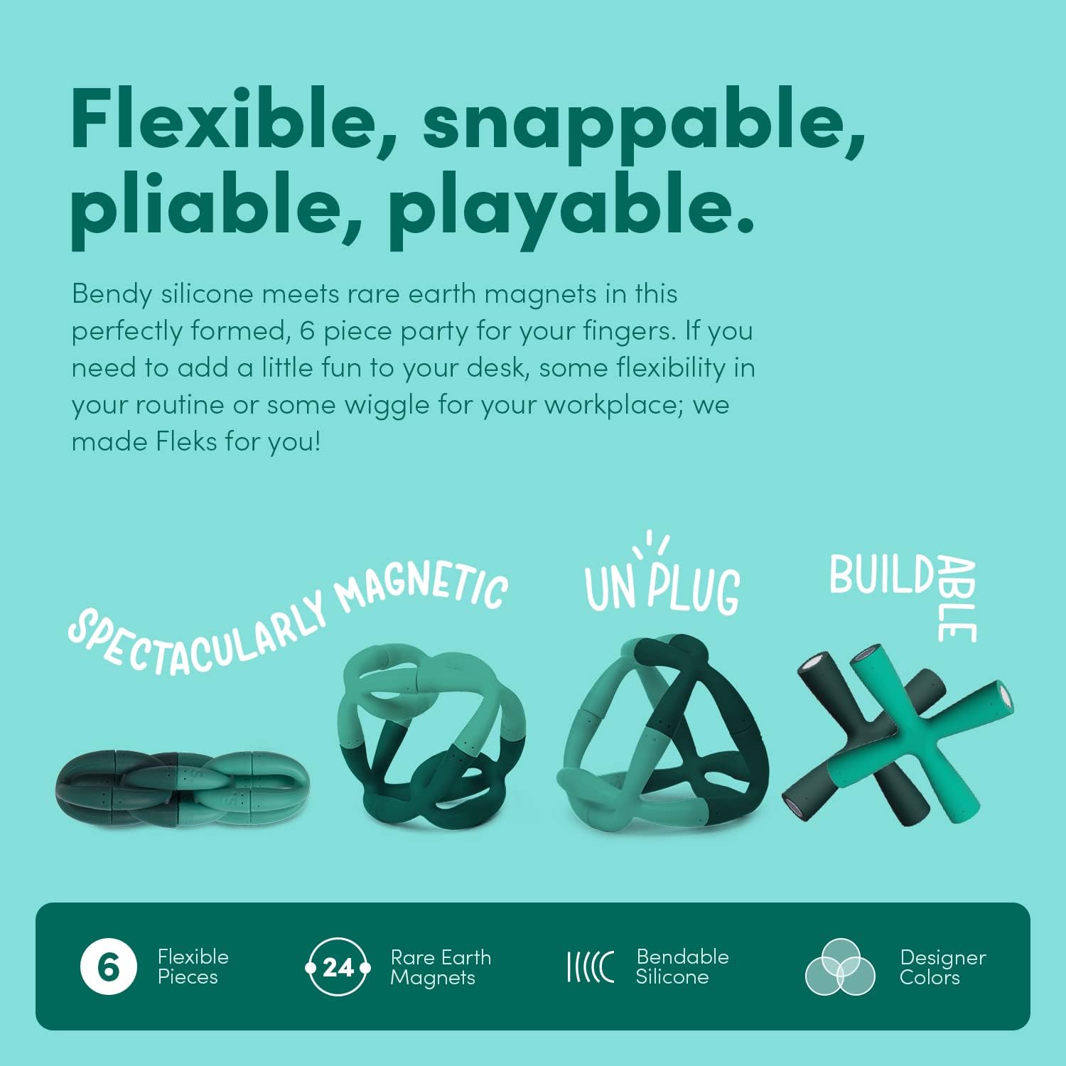 - SATISFACTION THROUGH INTERACTION: Fully flexible, super snappable, perfectly pliable and preposterously playable - Fleks are guaranteed to be what your fidgety fingers need. Soft but tough and smooth to the touch, every piece is designed for maximum satisfaction.