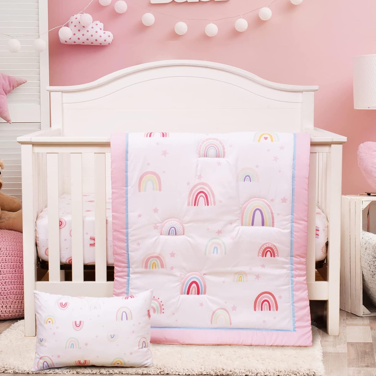 - [CUTE DESIGH] - This pink baby girl nursery bedding set features ,Stars,Rainbow, pattern girl nursery decor throughout the soft fabric for a safe and snug fit,brings the sweet dream into your little one nursery.