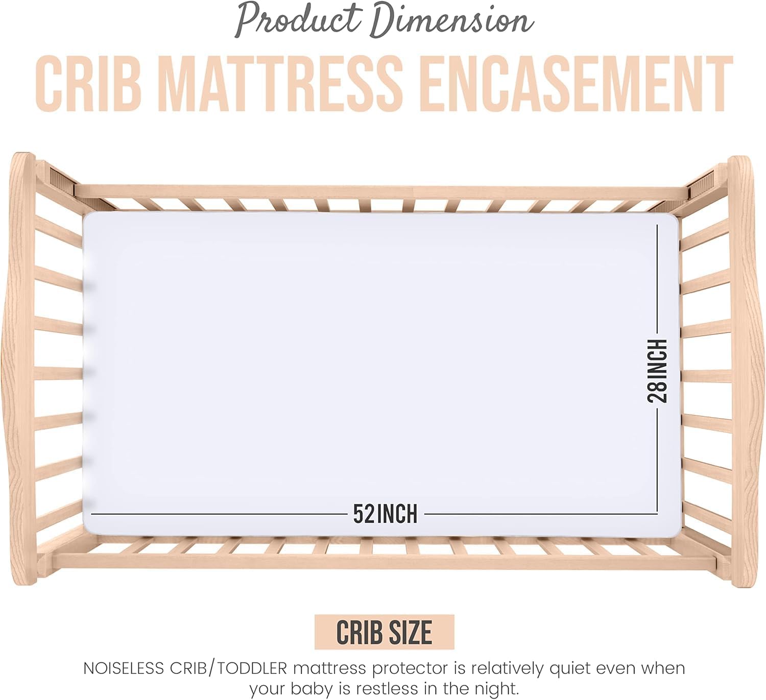 - Mattress Encasement - Fits Crib size mattress perfectly with dimensions 28 inches by 52 inches; 7 inches deep pocket