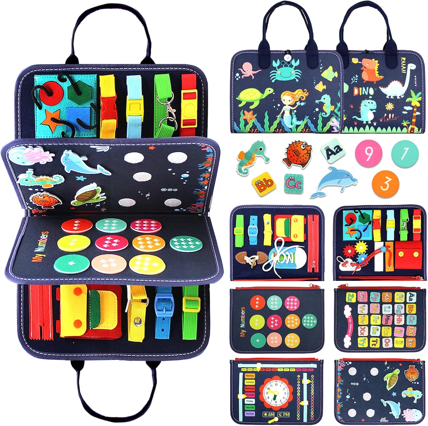 - Newly Upgraded BUSY BOARD Book: Combining busy book and traditional busy board, we designed this new Montessori busy board with more toddler activities for kids to explore and have fun. Features over 18 learning activities that help kids build dexterity and develop learning skills for preschoolers, including zippers, gears, buttons, shoelaces, clocks, alphabet, animals, numbers, calendar learning games and more