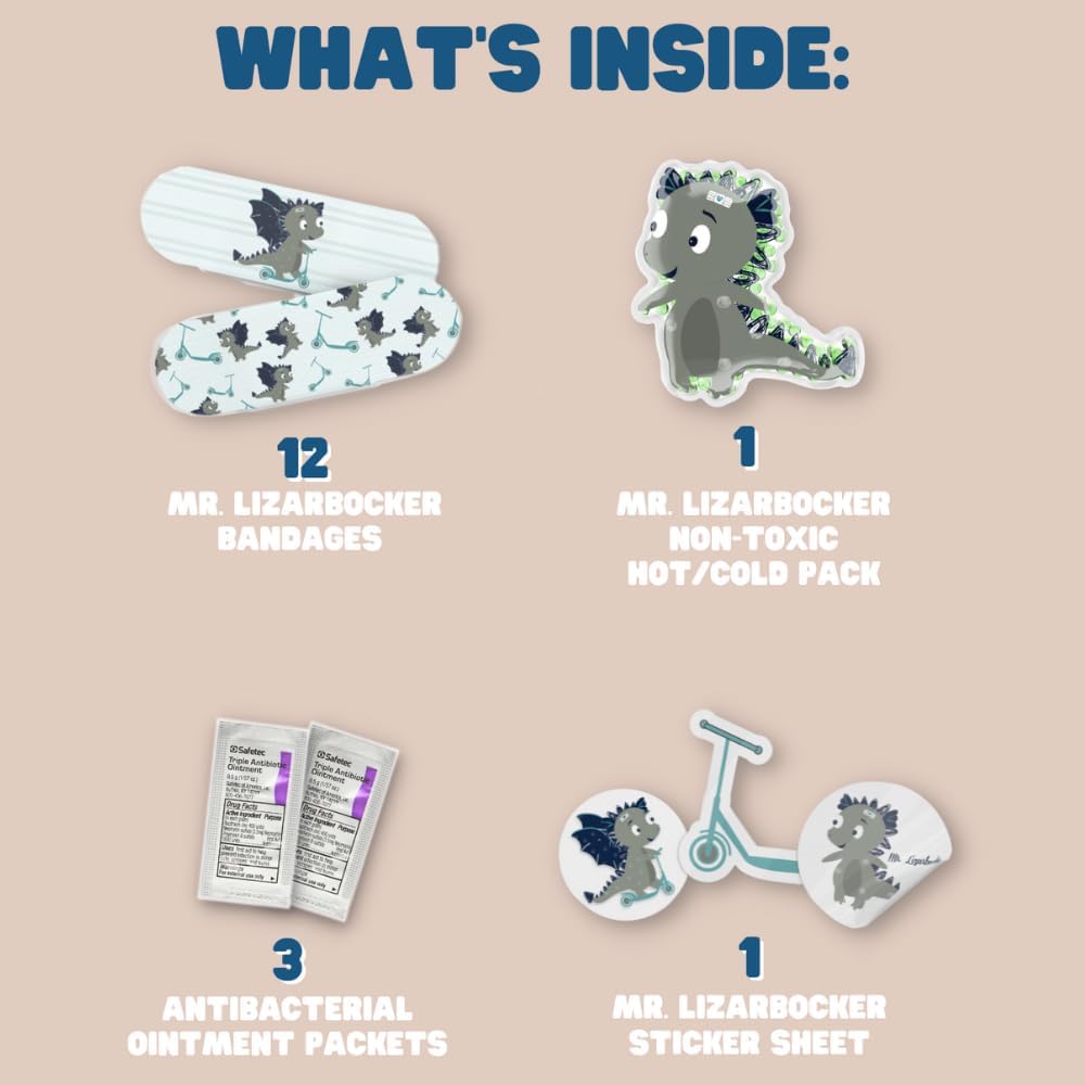 - π¦ΈββοΈ The Set Includes: This kids first-aid kit plush includes 1-character ice pack (for hot & cold use), 12 matching Mr. Lizarbocker Dragon bandages, 6 Mr. Lizarbocker Dragon stickers, and 3 triple ointment packets. This infant first aid kit is packed in a secret zipper pouch on the stuffyβs back.