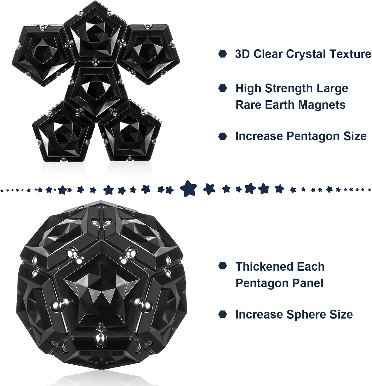 - [Develop Your Spatial Thinking]: Fold, shake, spin and stack the pieces. Connect the pentagonal plates together into sculpture-like forms. Click and clack the pieces around in a satisfying symphony of kaleidoscopic visuals. Flick your fingers like twisting tendrils as the magnetic ball transmogrifies your mind. Captivating 3D art!