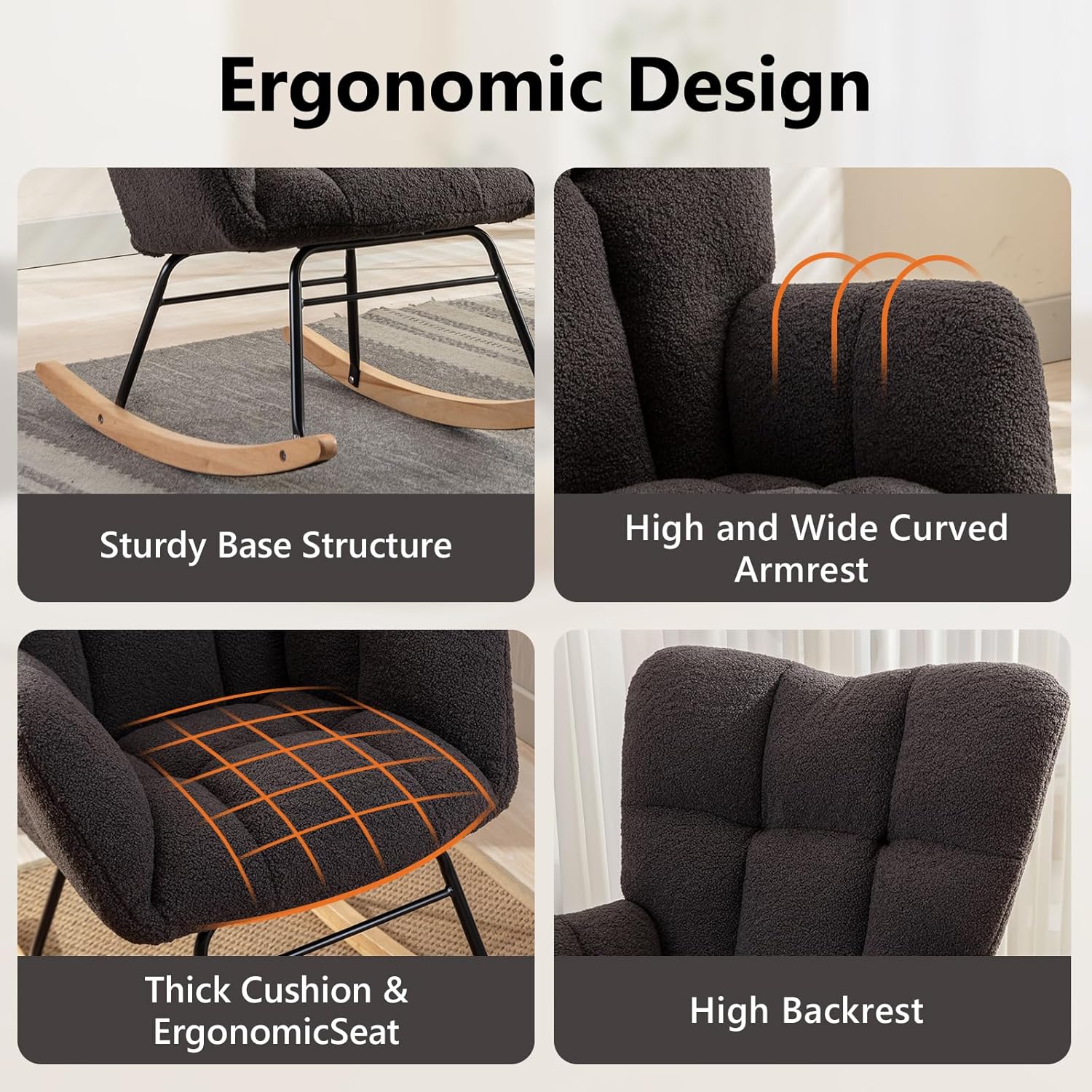 NIOIIKIT Nursery Rocking Chair Teddy Upholstered Glider Rocker Rocking Accent Chair Padded Seat with High Backrest Armchair Comfy Side Chair for Living Room Bedroom Offices (Dark Grey)