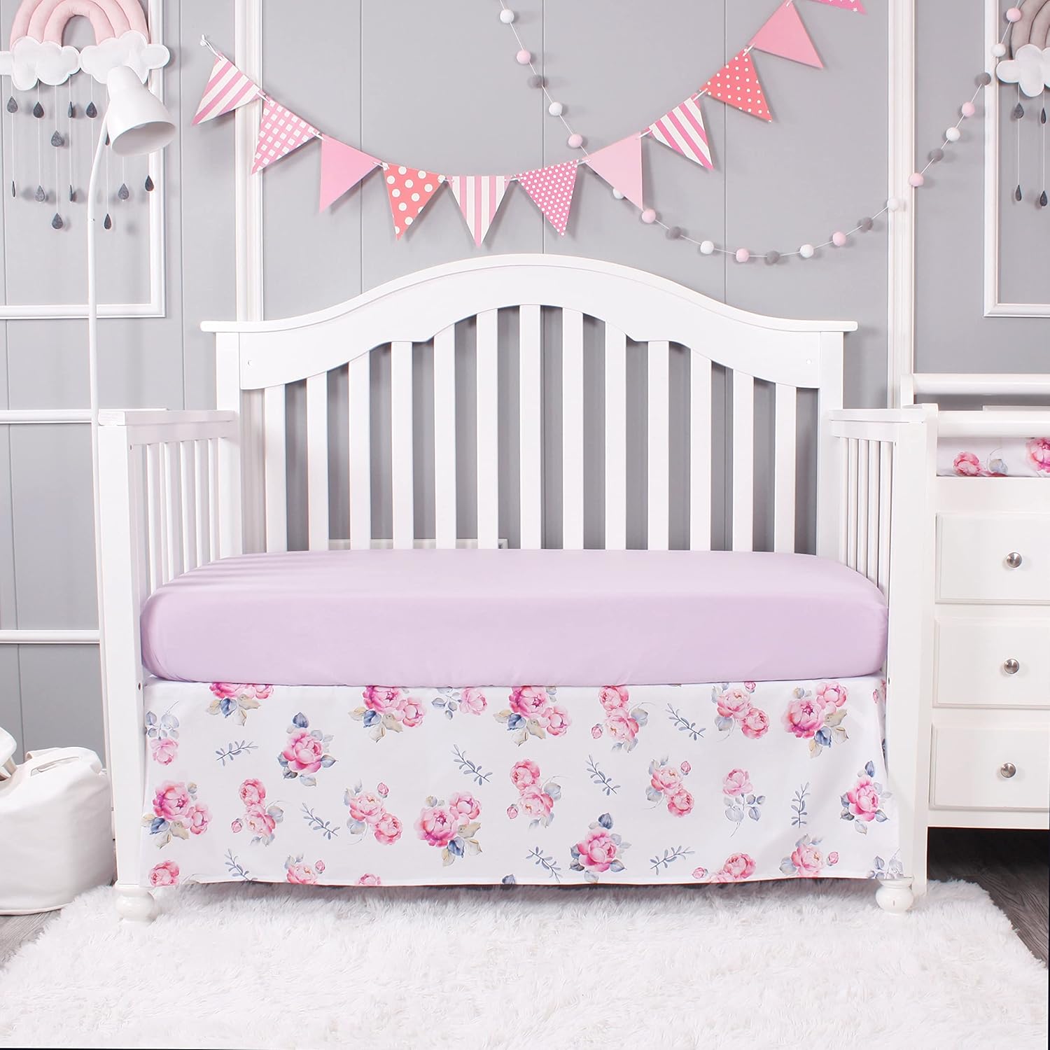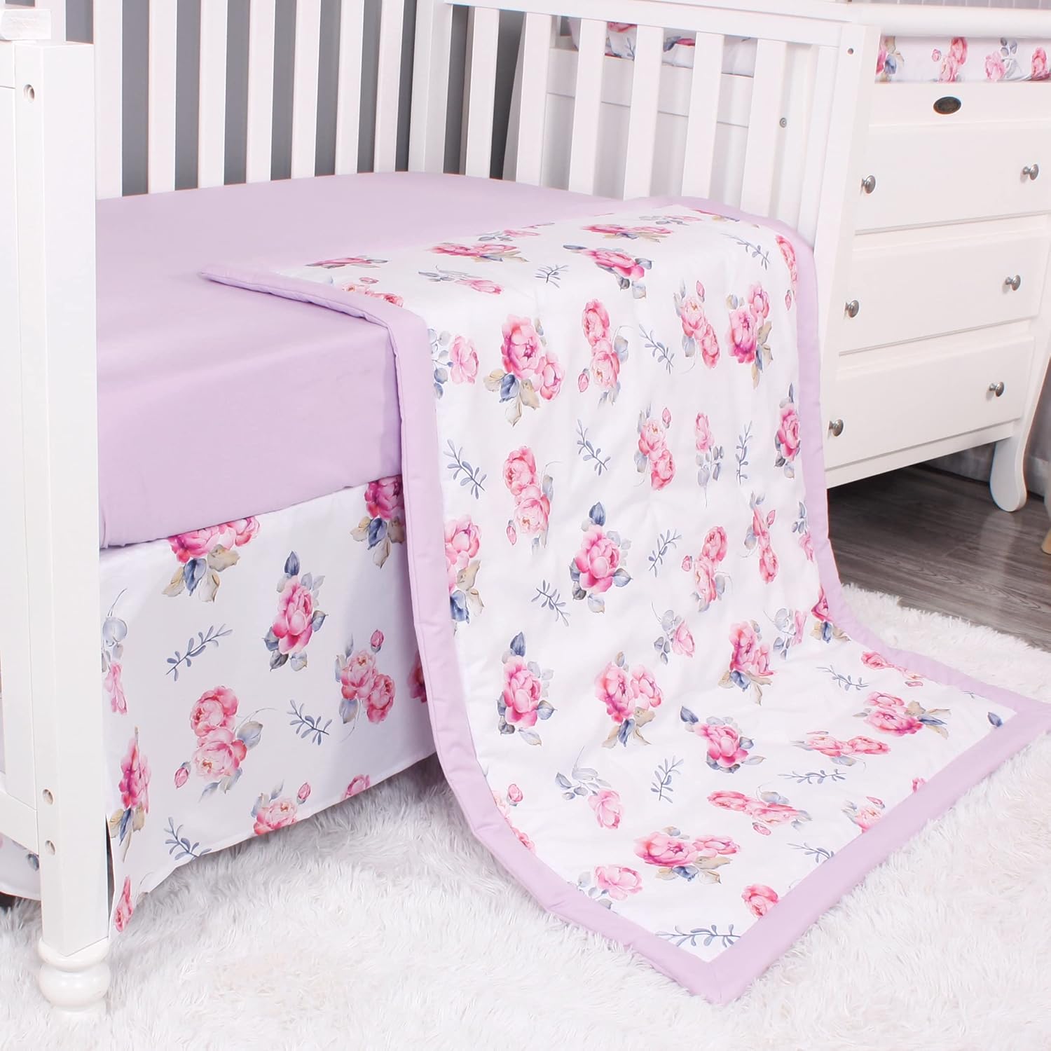 Belsden Floral 3 Piece Crib Bedding Set for Baby Boys Girls, Classic Nursery Bedding Essential Including Comforter, Crib Sheet and Crib Skirt, Ultra Soft Cozy, Floral Purple