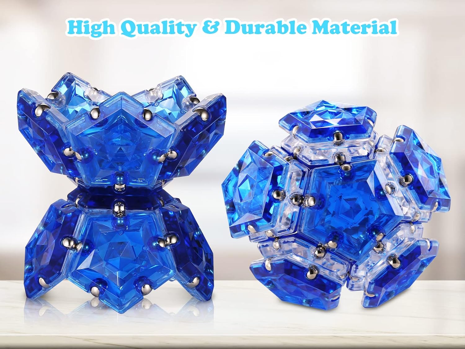 - [Develop Your Spatial Thinking]: Fold, shake, spin and stack the pieces. Connect the pentagonal plates together into sculpture-like forms. Click and clack the pieces around in a satisfying symphony of kaleidoscopic visuals. Flick your fingers like twisting tendrils as the magnetic ball transmogrifies your mind. Captivating 3D art!