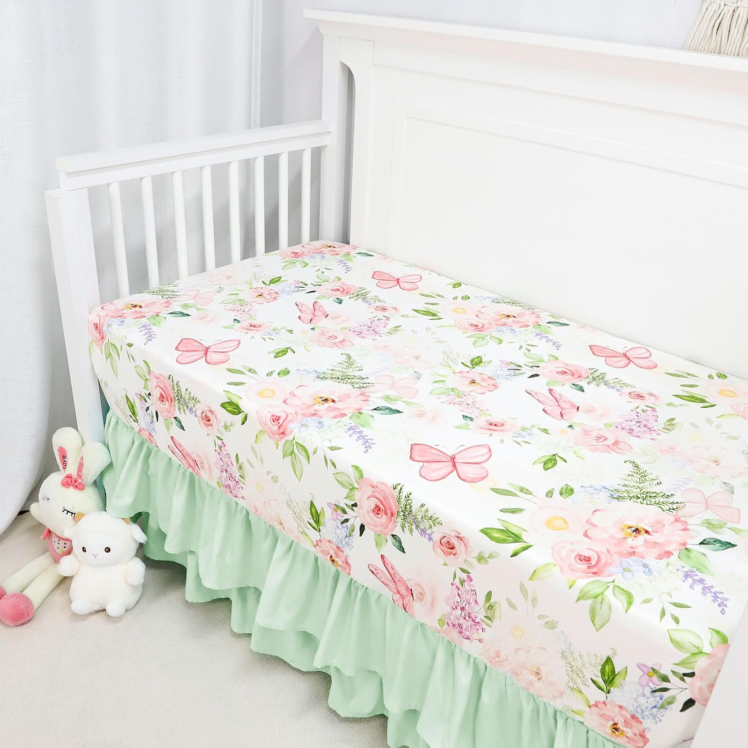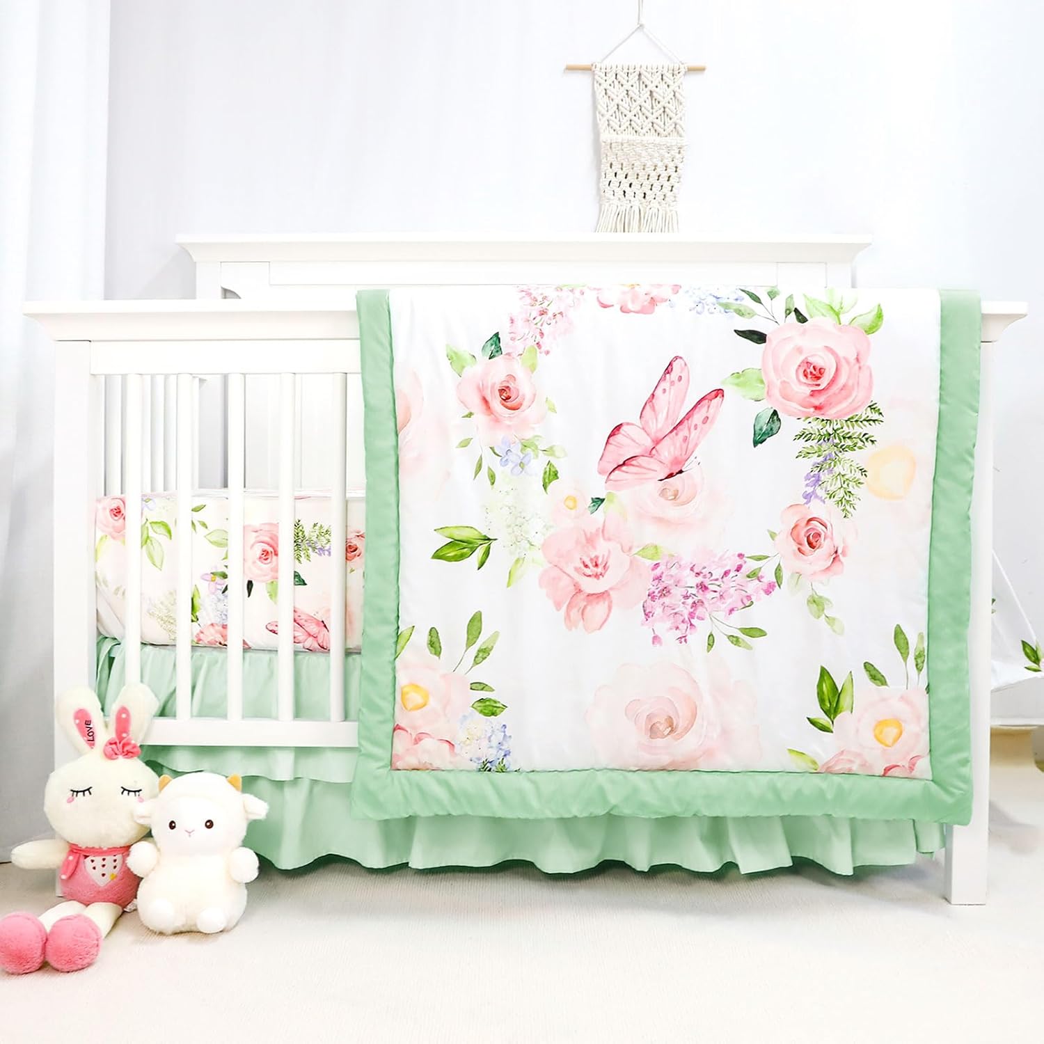 4-Piece Crib Bedding Set, Baby Girl Crib Bedding Set Butterflies Floral Nursery Bedding Set Includes Comforter, Fitted Crib Sheet, Crib Skirt, and Diaper Stacker, Green & Pink