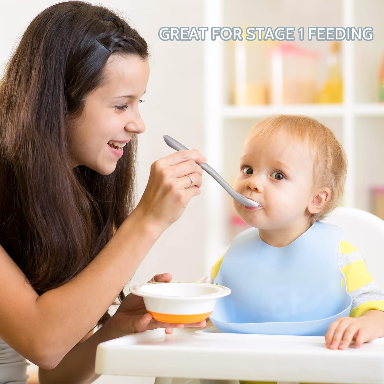- Soft, Pliable Spoon & Tip: Spoons are smooth and comfortable for baby's soft and fragile hands without the cumbersome carvings and patterns that rub hands. The flexible and soft spoon tips have no support inside and are not hard like plastic or metal spoons, which are good protection for babies' delicate and sensitive mouths and developing teeth. Smooth design prevents water and food from getting trapped, starting solids is a breeze with our silicone spoons!