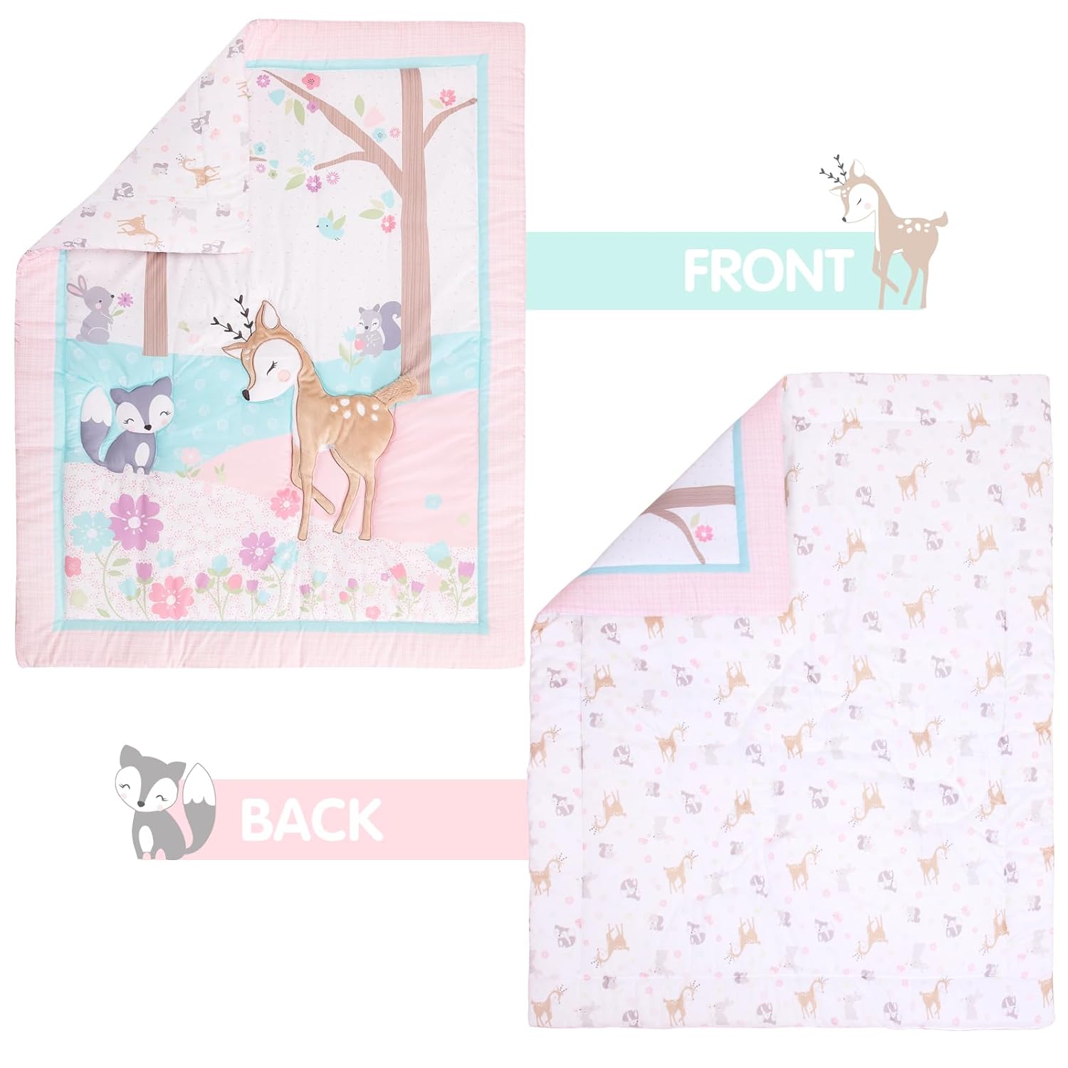 - [Perfect Gift]The little deer woodland 3-piece set is specially designed for girls, with charming and playful decorations that can beautify the baby's room. Let your baby start experiencing the beauty of nature from here! This crib bedding set is also the perfect gift for baby shower, birthday or Christmas.
