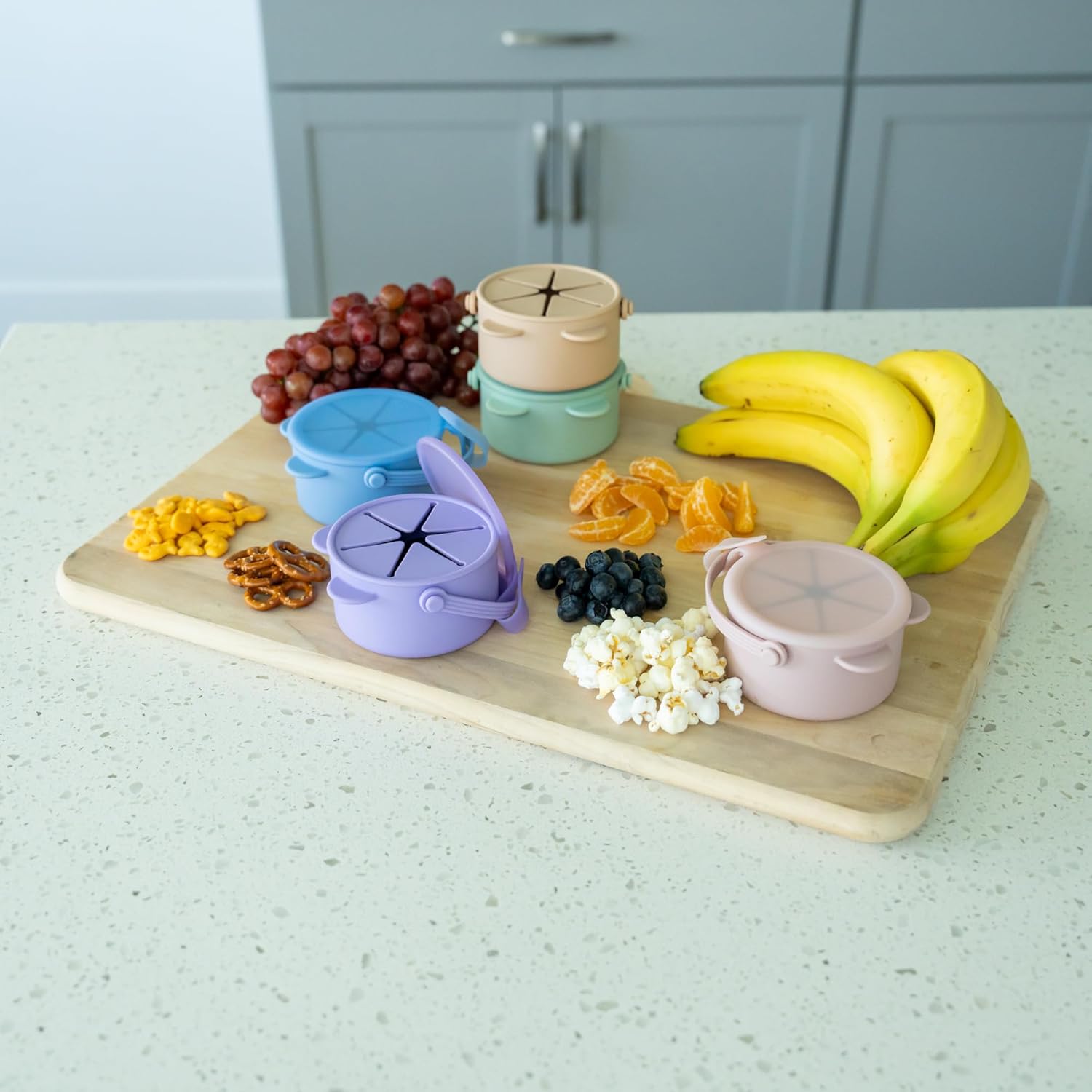 - Munch on the Move with Ease: Our 4.2” silicone snack cup promises easy handling and effortless on-the-move munching; The petal-like opening on these baby snack cups welcomes those little fingers, making snacking a breeze every time