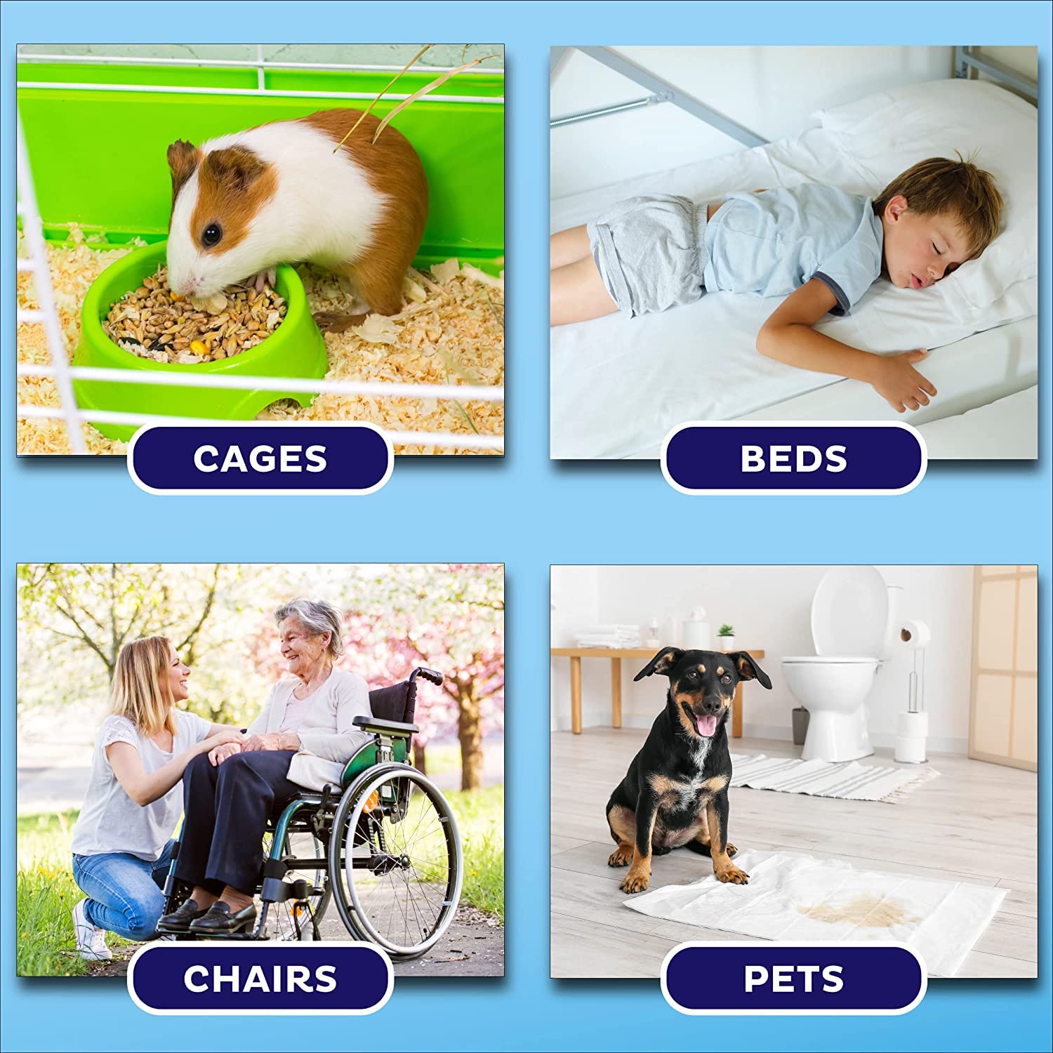 - Multipurpose Support – Our urinary incontinence pads are not only great for young children or elderly hospice care patients, they can be used by pet owners who want to help train young puppies or support older dogs.