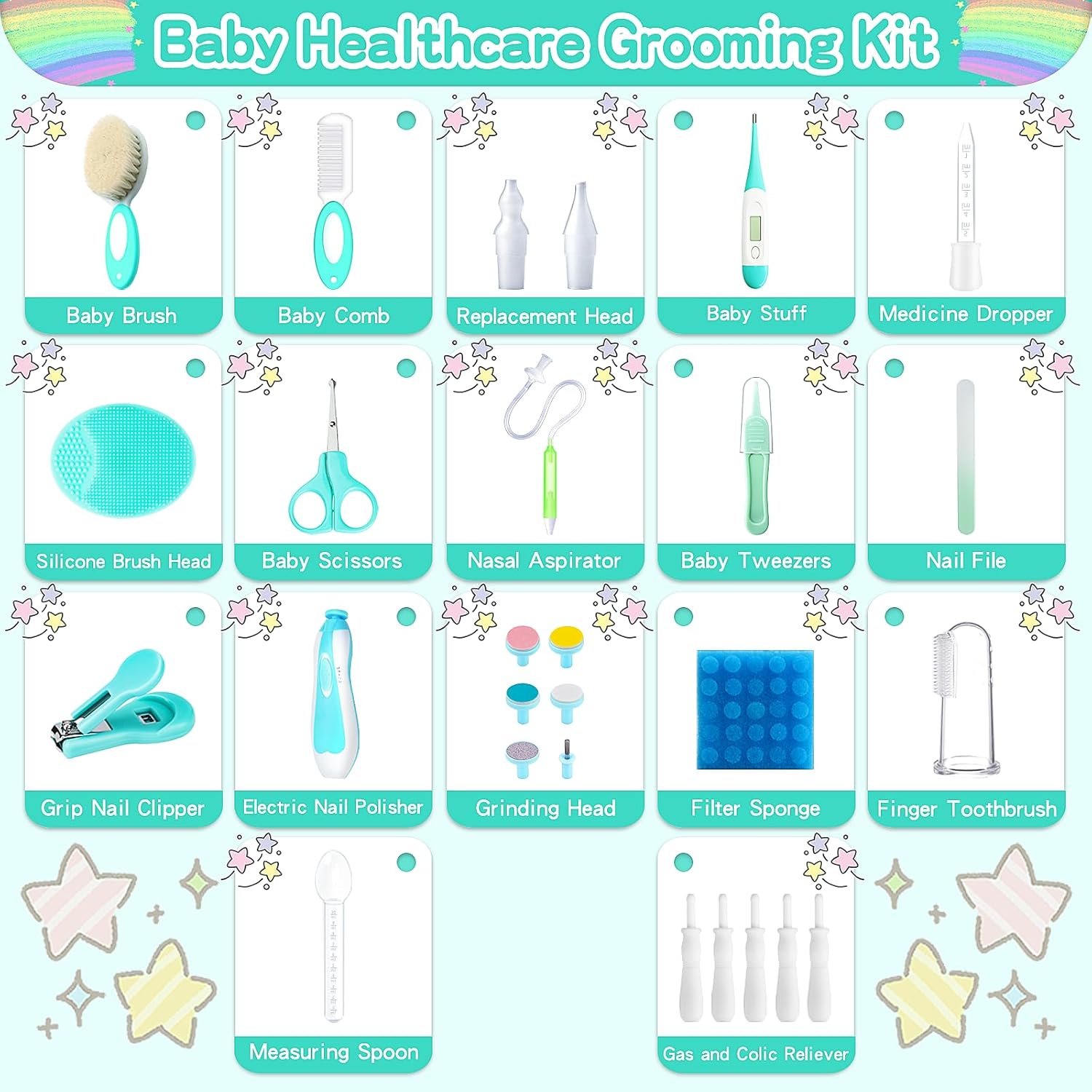 - Complete Baby Healthcare And Grooming Kit: The package includes scissors, finger toothbrush, hairbrush, hair comb, medicine dropper, nasal aspirator, nail clipper, gas and colic relievers, electric nail trimmer, etc. Enough accessories to keep every baby always getting good grooming and health.