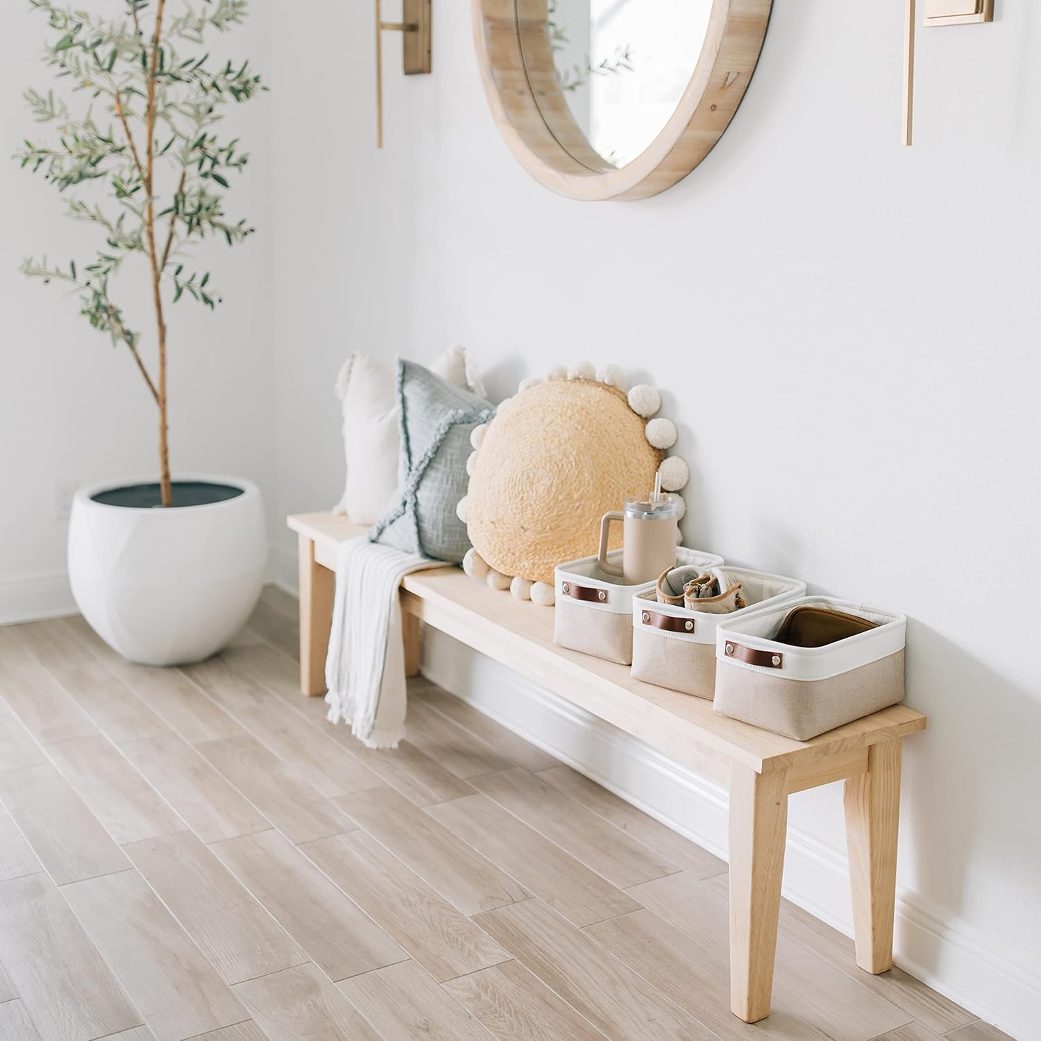 - Decorative Fabric and Vegan Leather – These versatile storage baskets for organizing your everyday life are made with a thick, high-quality fabric and fitted with leather handles to add a stylish touch to a living room, bedroom, office, or personal space.