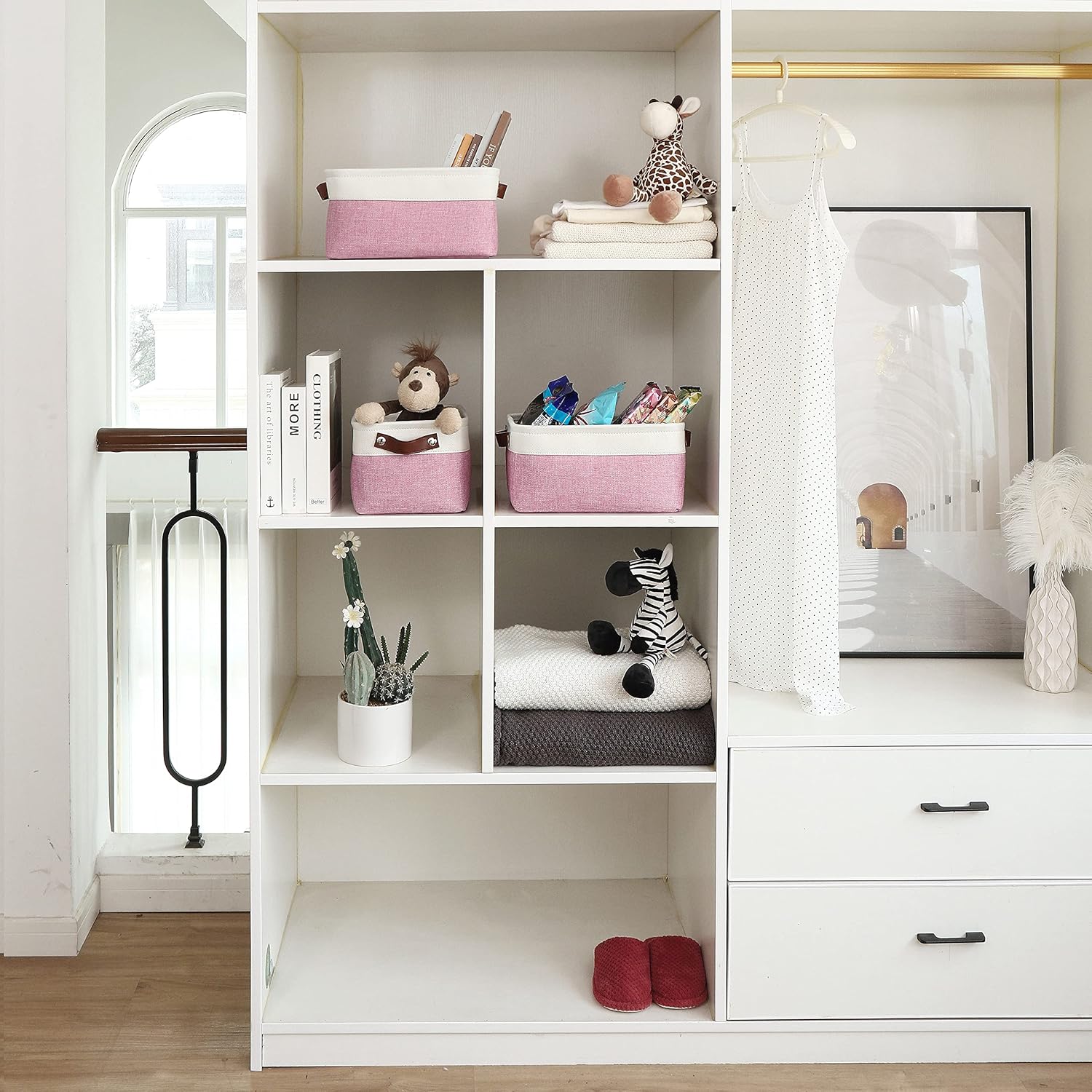 OrganiHaus Small Fabric Storage Baskets for Shelves 6 Pack, 12x8in Closet Storage Bins for Shelves, Cloth Baskets for Organizing, Linen Closet Organizers, Fabric Basket, Pink/White