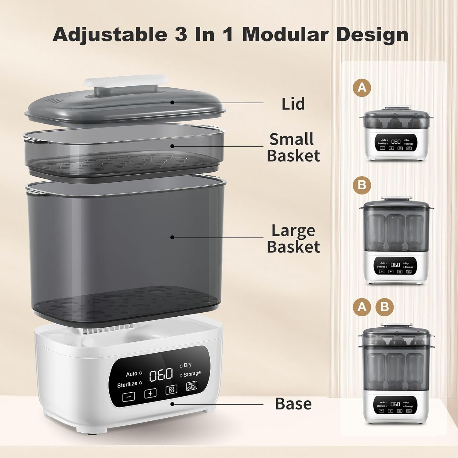 - 【4 in 1 Multi-function】This bottle dryer is designed with a fully automatic operation and LED countdown display, you can steam only, dry only, steam and dry, and 72-hour secure stroage, convenient for busy parents. The small basket and large basket can be freely and flexibly combined to save space and meet your needs.