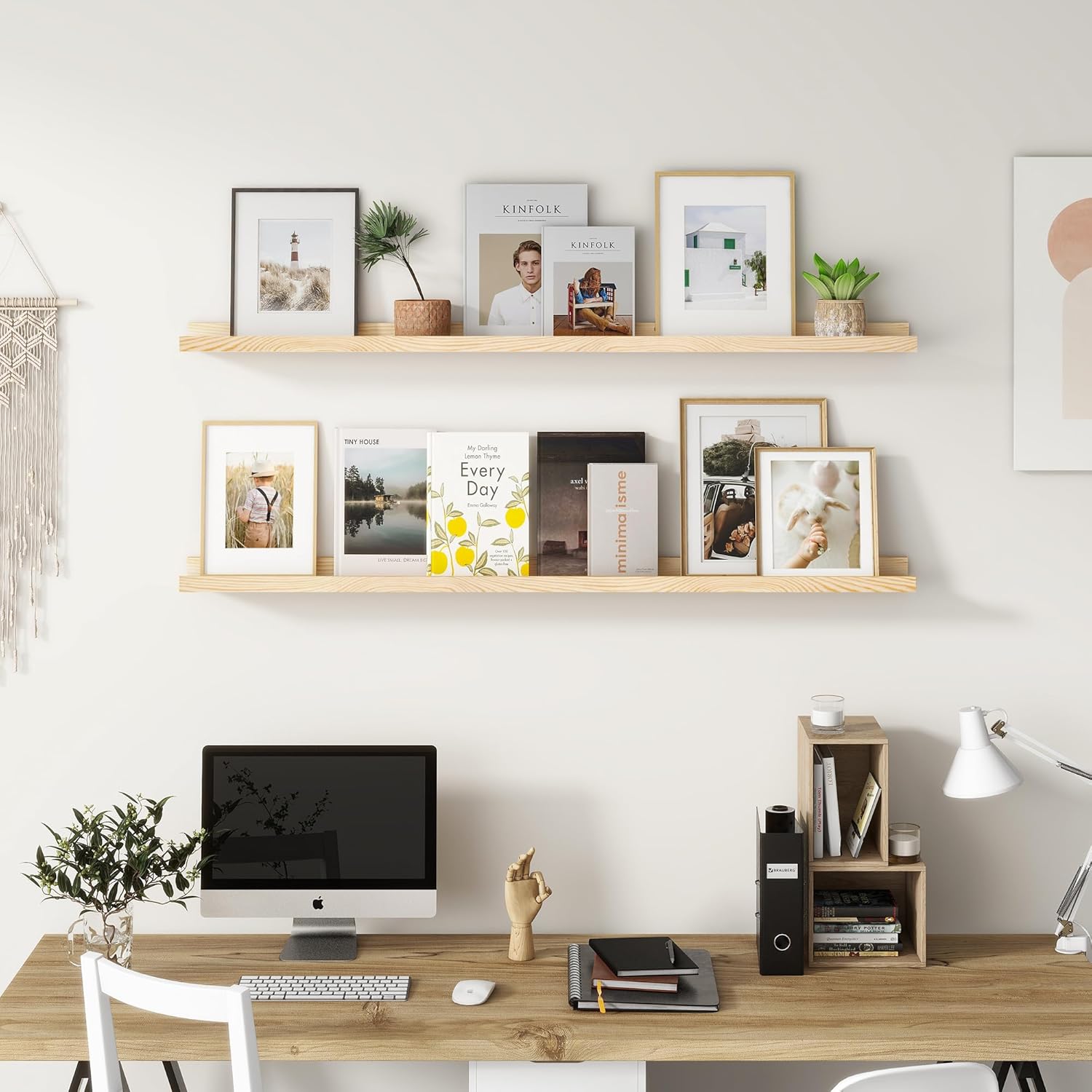 Picture Ledge Shelf for Wall, 48 inch Solid Pine Wood Nursery Book Shelves 2 Packs, Floating Ledge Shelves for Kids' Room Bedroom Bathroom Living Room Photo Frames Office Nursey Wall Decor, Natural