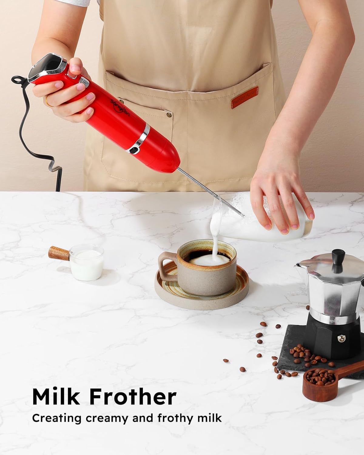 - 【3-in-1 Hand Blender】Our multifunctional hand blenders immersion comes with three essential attachments: a blending arm, a whisk, and a frother. From crafting delicious beverages to whipping up savory sauces, whether you need a milk frother, electric whisk, electric mixer, or drink mixer, this is the ultimate kitchen companion