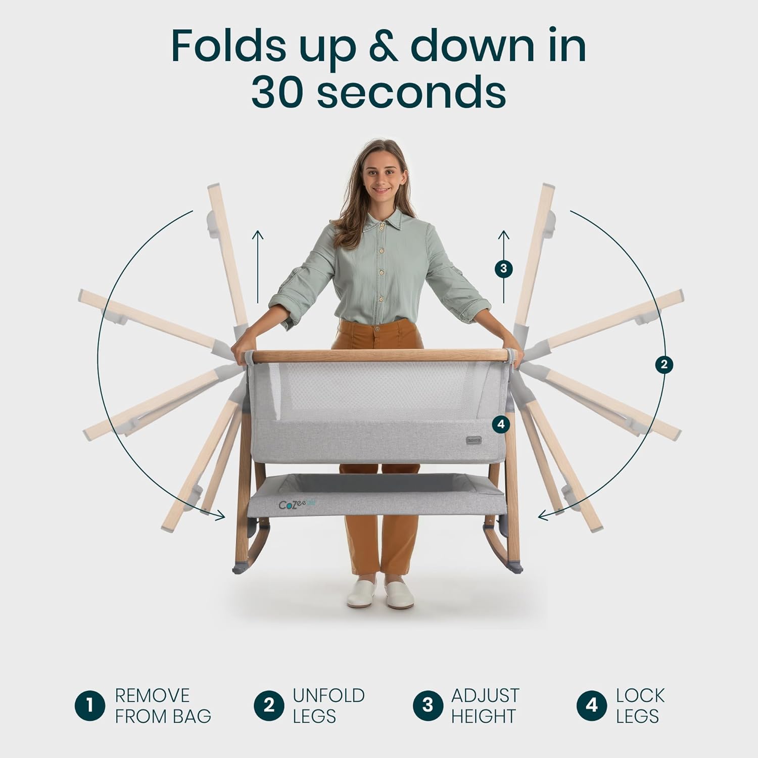 CoZee® Air Baby Bassinet & Bedside Sleeper - Rocking Bassinet for Baby, Fast-Folding with Travel Bag, Deluxe Airflow Mattress & 6 Mattress Heights, 0-6 Months (Silver & Oak)