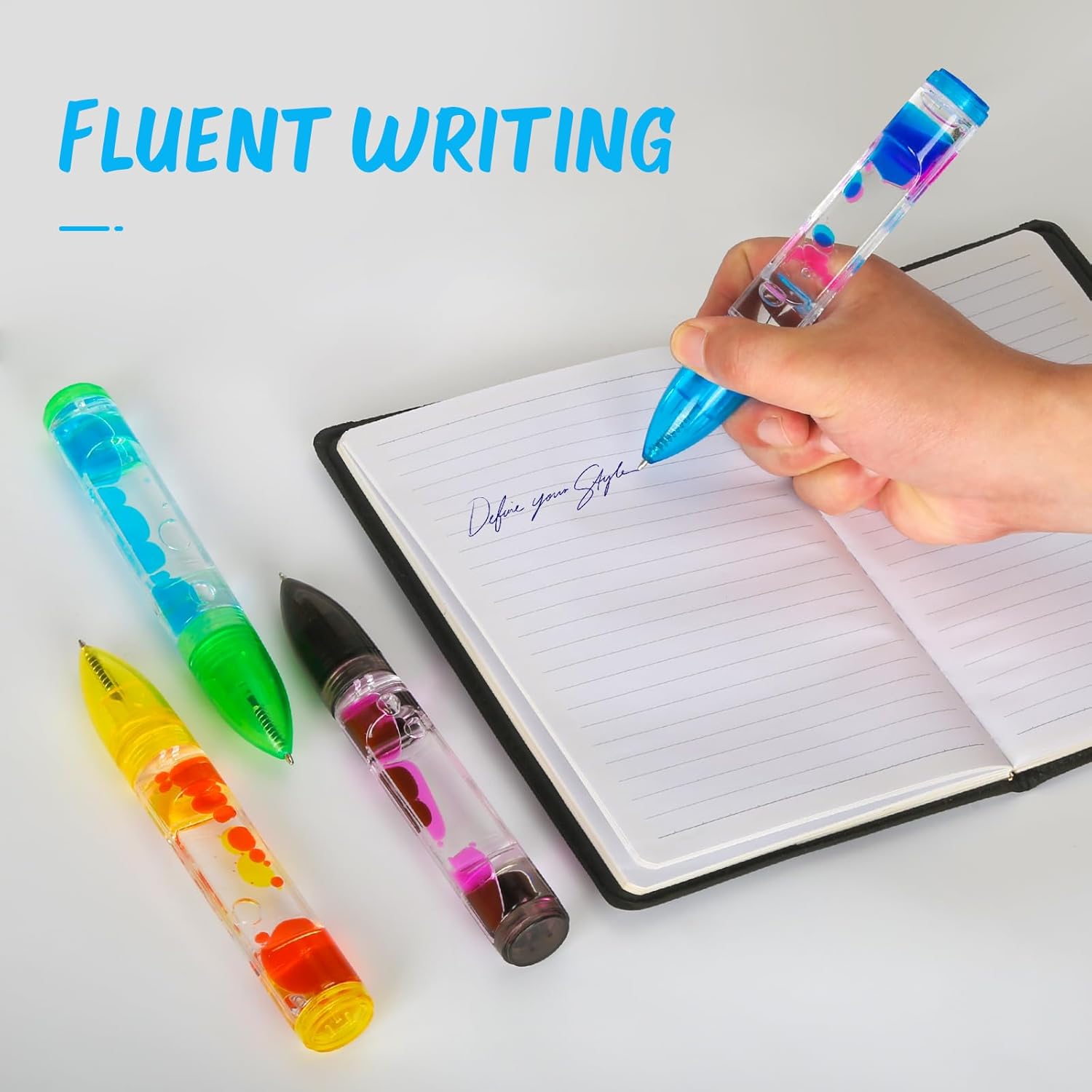 - Not Your Ordinary Pen- Every order comes with 4 liquid motion novelty pens (Blue,Yellow, Green, and Black). Each pen writes in a different color too! Flip the pen up/down and watch the colorful water beads slowly drip down.
