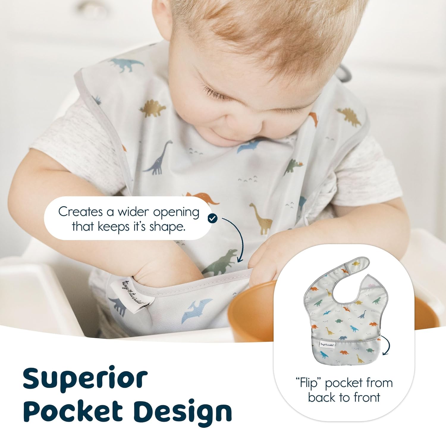 Tiny Twinkle Mess Proof Baby Bibs for Eating - Waterproof, Wipeable Bibs - Toddler Bib- Travel Friendly - PFAS, PVC, BPA, Phthalate Free - Baby Food Bib (3 Pack,Dinosaur)