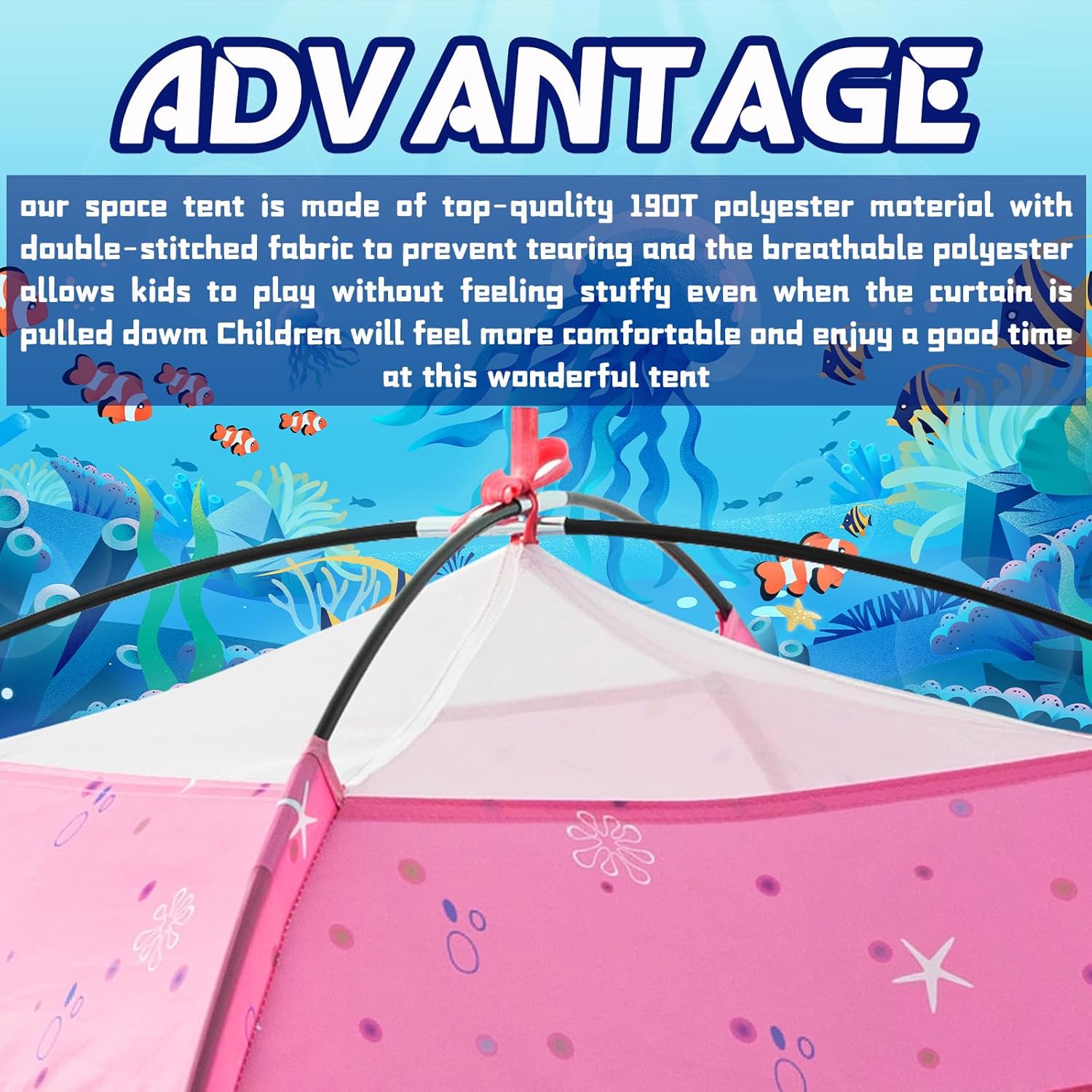 - The tent is designed with three themes: mermaid, underwater world and space astronaut. The tent is made of high-quality polyester material and is double-stitched to prevent tearing. The support rods are made of plastic-coated fiberglass, which has good elasticity and can prevent breakage. Mesh panels on top promote air circulation while allowing family members to see inside.