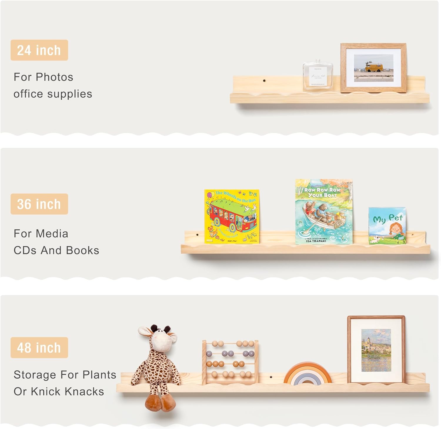 Fun Memories Picture Ledge Shelf for Wall, 36 inch Pine Wood Nursery Book Shelves Set of 2- Wall Book Shelves for Kids Room, Home Decor - Kitchen Spice-Natural