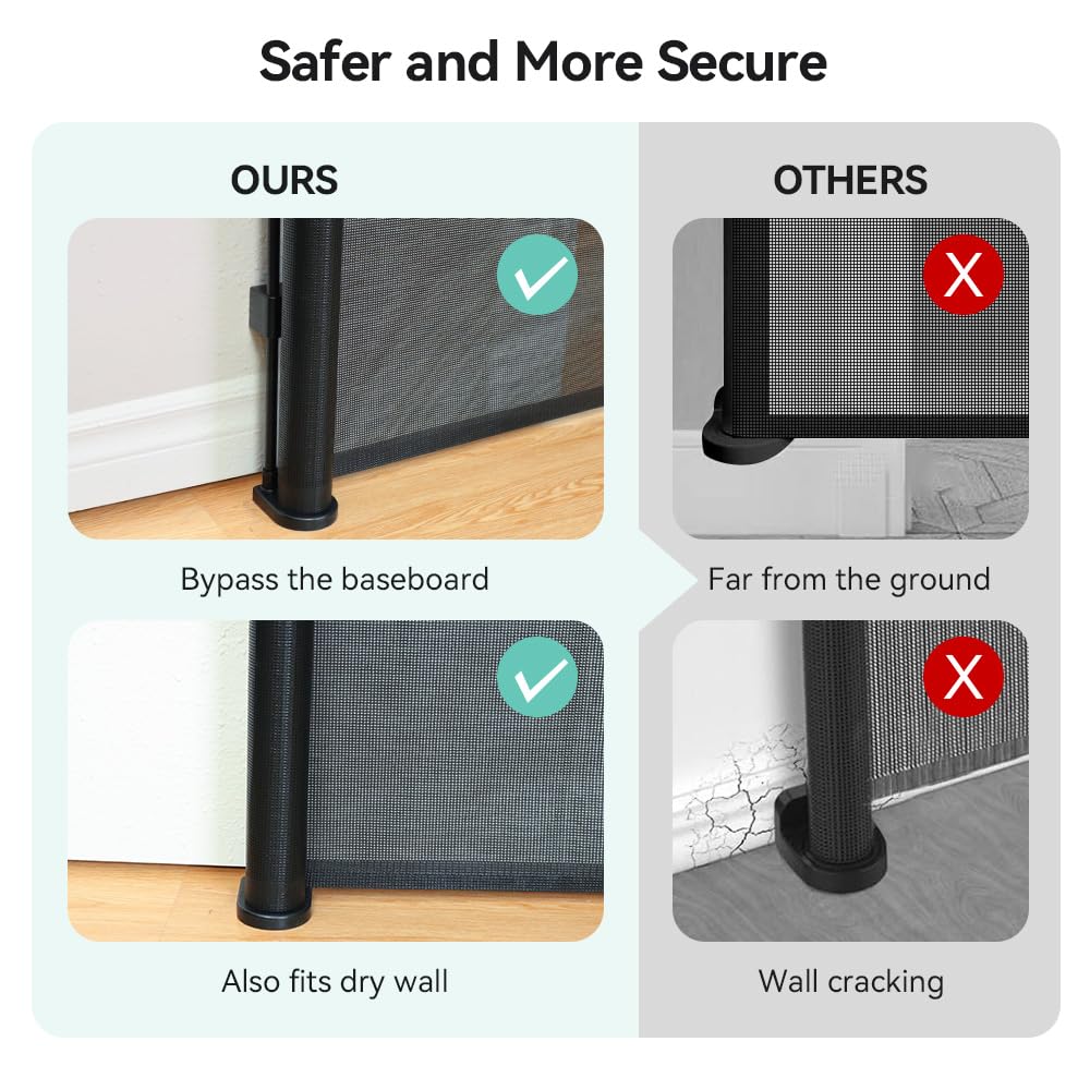 - Easy to Install and Use: Installation is easy with accompanying accessories suitable for various wall types. The retractable gates for dogs includes sliding adjustments on its side for installation near skirting lines or on gypsum walls, preventing wall cracking. However, please note that installation of this extra wide mesh dog gates for the house requires drilling
