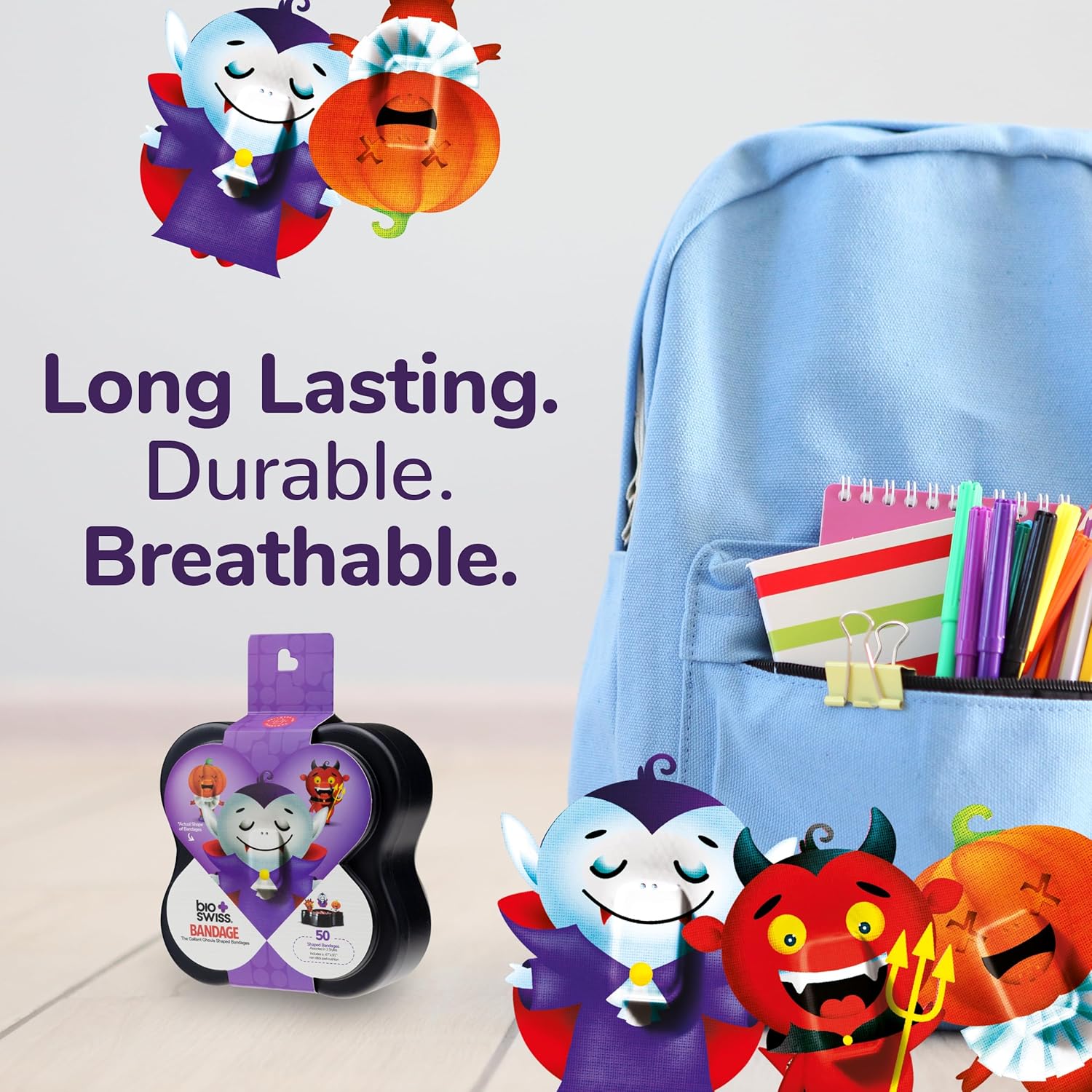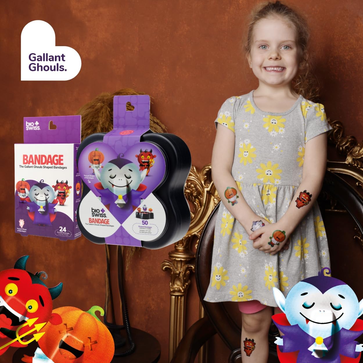 - GHOUL HALLOWEEN BANDAGES: This 50 piece pack of frightfully fun Halloween Ghoul bandages features Felix the Devil, Draco the Pumpkin, and Darthula the Vampire shapes, and is great for putting a smile on kids' faces while protecting wounds such as cuts, scrapes, and burns; sticky bandages come in a cute plastic container and are perfect for kids and adults alike, and also for school nurses and pediatric doctors