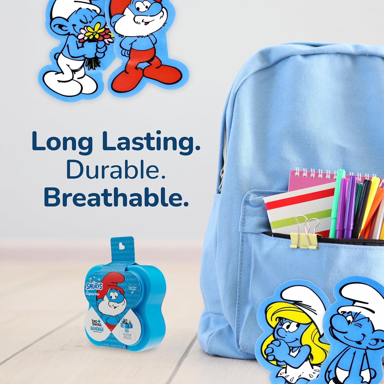 BioSwiss Bandages, The Smurfs Classic Shaped Self Adhesive Bandage, Latex Free Sterile Wound Care, Fun First Aid Kit Supplies for Kids and Adults, 50 Count Plastic Case