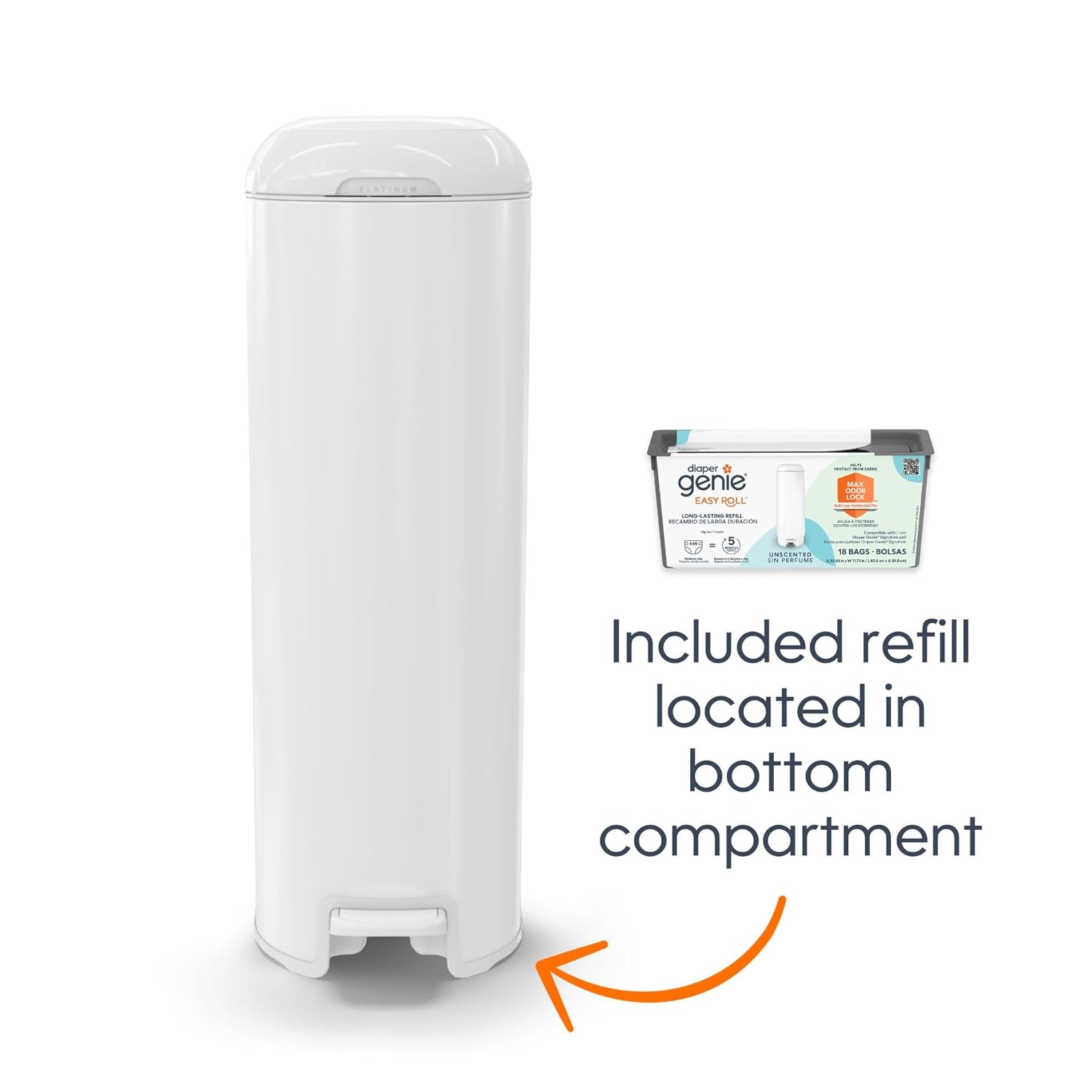 - Long lasting refill – pail comes with Easy Roll refill that holds up to 846 newborn diapers and lasts up to 5 months. THE REFILL CARTRIDGE IS LOCATED IN BOTTOM COMPARTMENT OF PAIL.