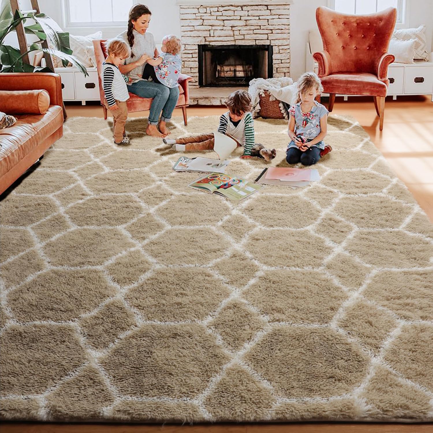 ONASAR 8x10 Area Rugs for Living Room, Fluffy Beige and White Bedroom Rug, Washable Geometric Boho Large Soft Plush Shaggy Fuzzy Floor Carpet for Nursery Kids Classroom Playroom Dorm Home Decor