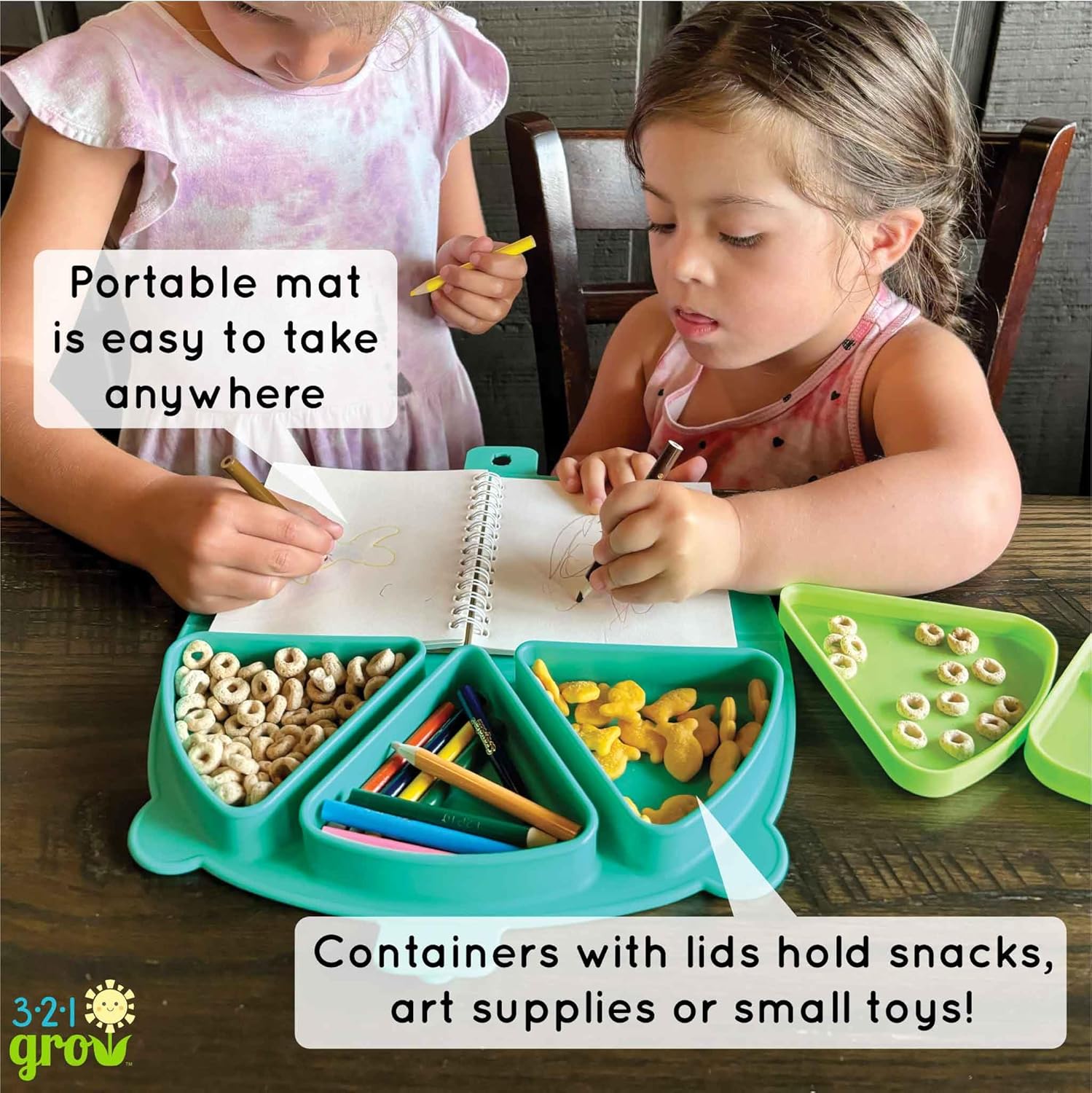 - THREE BUILT-IN CONTAINERS WITH LIDS: Each container holds 1/2 cup (4 oz) of small snacks or toys. The snack mat keeps little ones entertained at restaurants while waiting for food, provides a clean surface on the go and even helps picky eaters by letting them choose which container to open.