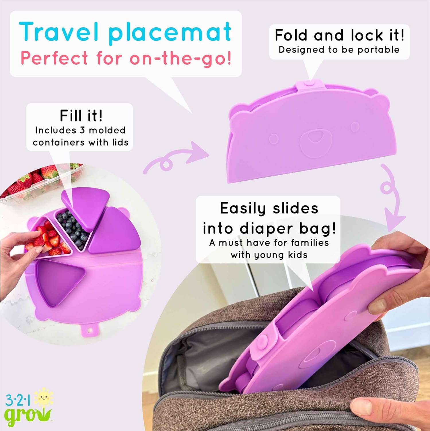 Silicone On-The-Go Snack Mat – Foldable Reusable Placemat with 3 Compartments and Lids – Travel-Friendly Baby and Toddler Snack Plate – Dishwasher Safe (Plum)