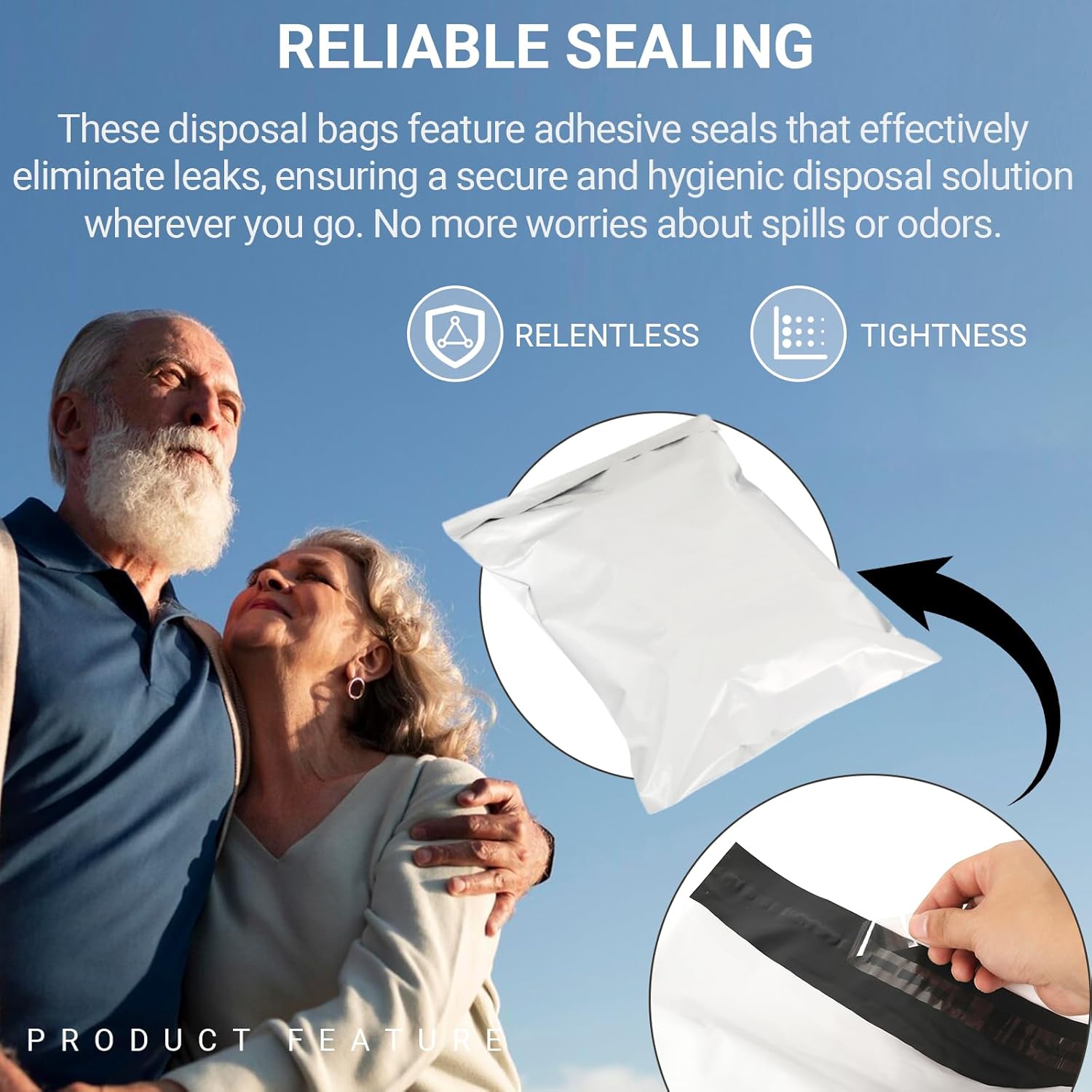 - Reliable Sealing: Say goodbye to unsightly messes and unwanted odors with our adult diaper disposal system. These disposal bags feature adhesive seals that effectively eliminate leaks, ensuring a secure and hygienic disposal solution wherever you go. No more worries about spills or odors.