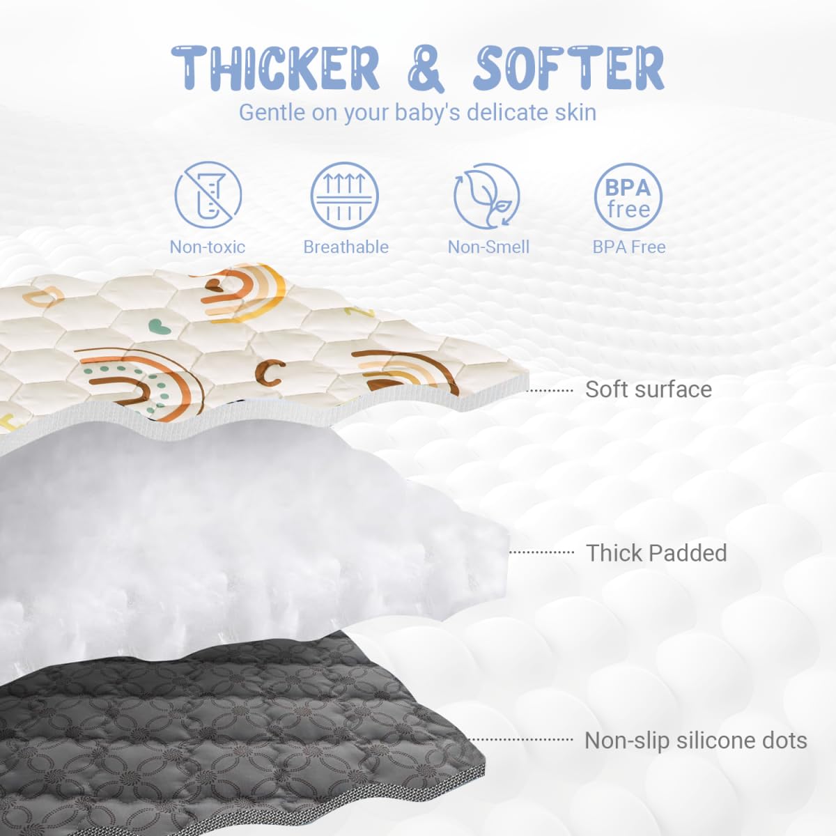 - 【Portable & Machine Washable】50x50 play mat is a single durable piece that can be easily folded and packed, making it perfect for on-the-go playtime. the special quilting process can support it to be washed in the washing machine without deformation, easy to clean and maintain.