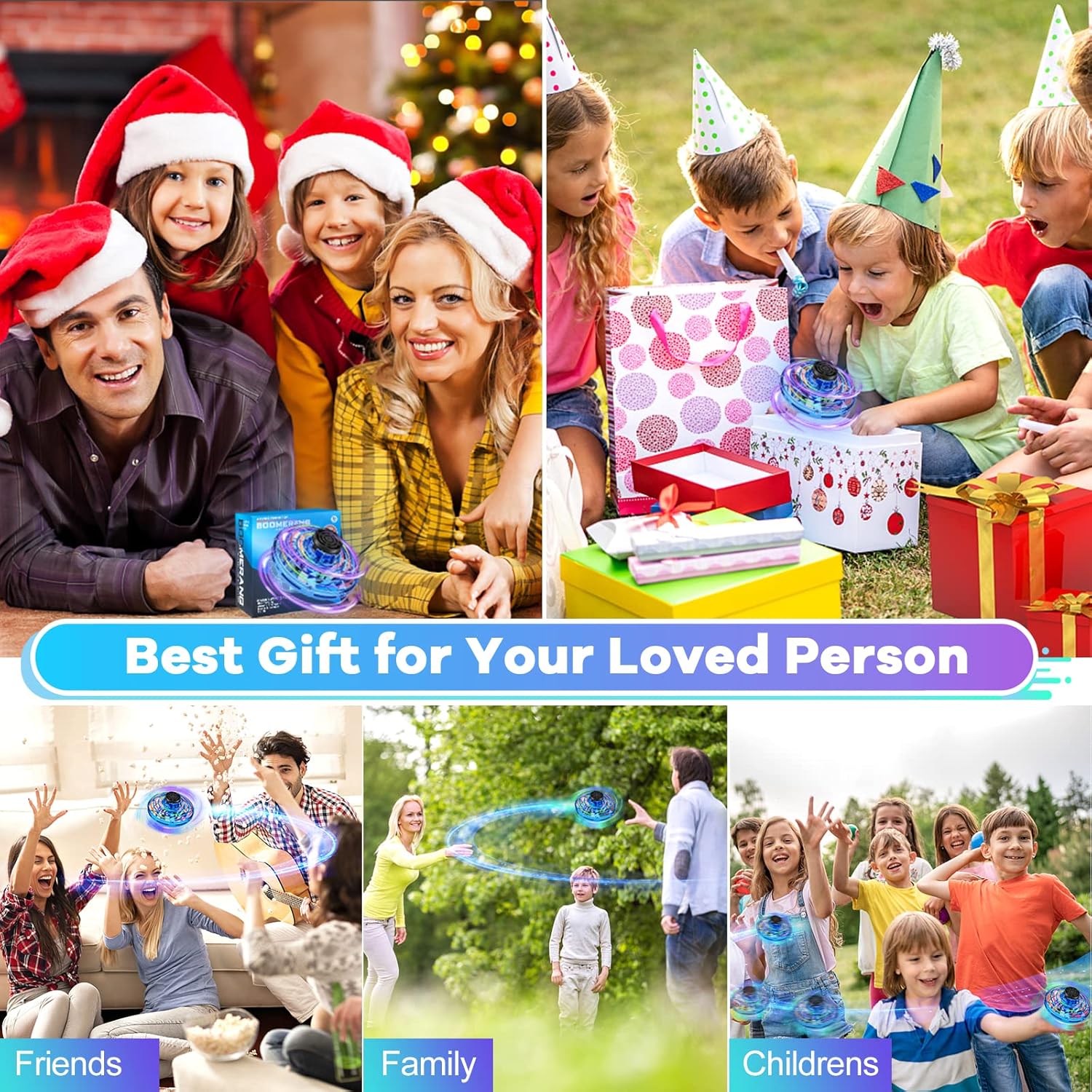 - Fun and Simple Ufo Drone Flying Toy:Turn on the power button of flying toys,hold down the center axis to rotate the wheel to start,then throw it away and fly.Different throwing speeds and angles allow different flight paths,tricks,and high-speed maneuvers.Stop the flying by grabbing the mini drone with your hand.You can have fun with friends, family,colleagues indoors,outdoors,at school and in the office.Hover toy is a popular social game at birthday parties,family gatherings.